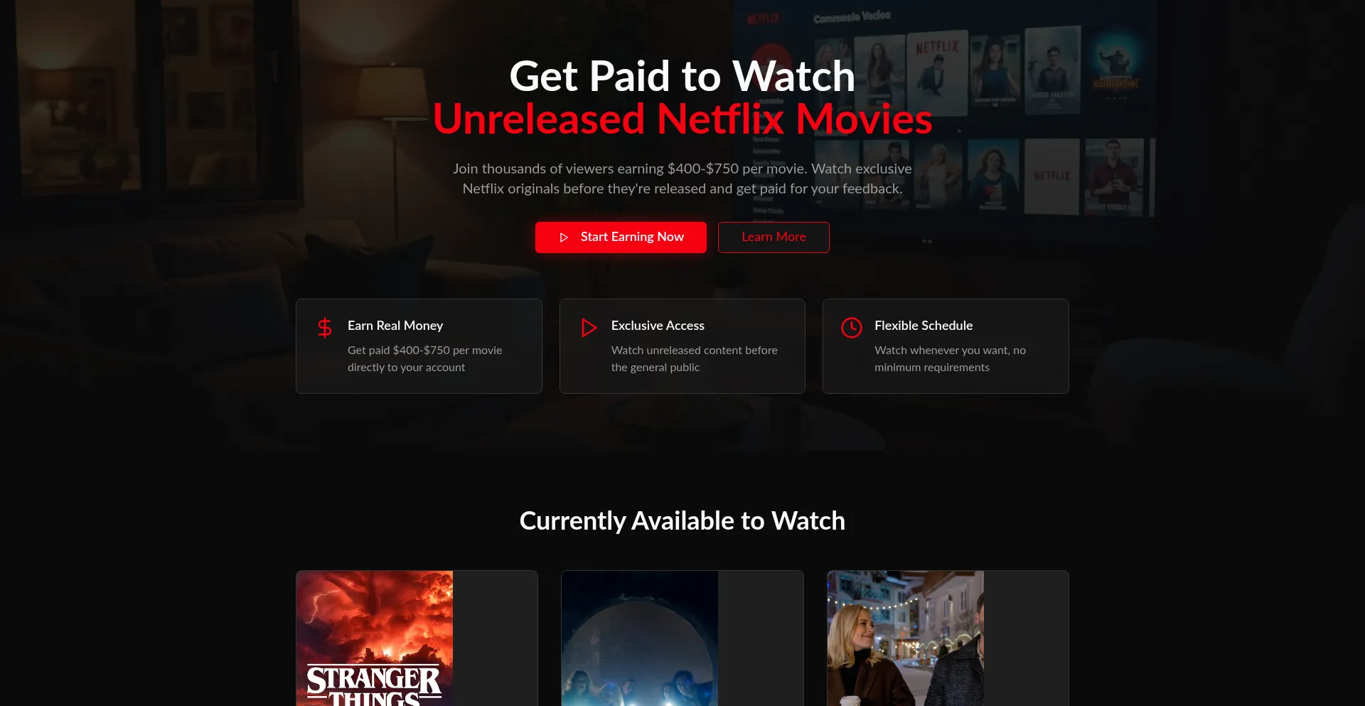 Join thousands earning money watching unreleased Netflix originals. Get paid $400-$750 per movie. Watch exclusive content before release. Sign up free today!
