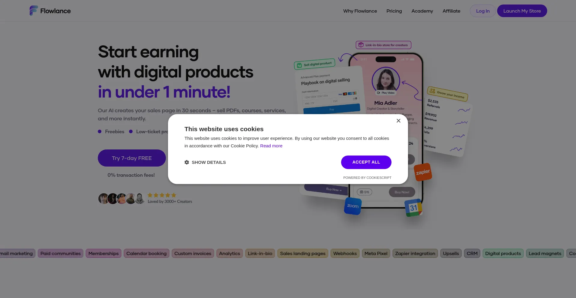 The website implements cookie consent mechanisms in compliance with privacy regulations such as GDPR or CCPA. This demonstrates that flowlance.com adheres to data protection standards and provides users with control over personal data collection practices.