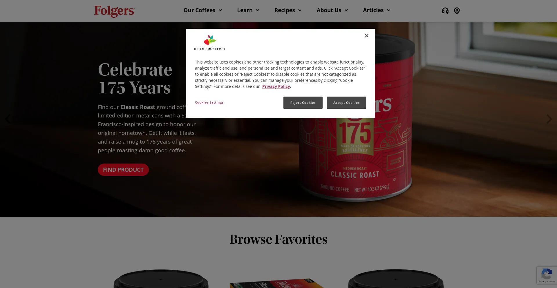 The website implements cookie consent mechanisms in compliance with privacy regulations such as GDPR or CCPA. This demonstrates that folgerscoffee.com adheres to data protection standards and provides users with control over personal data collection practices.