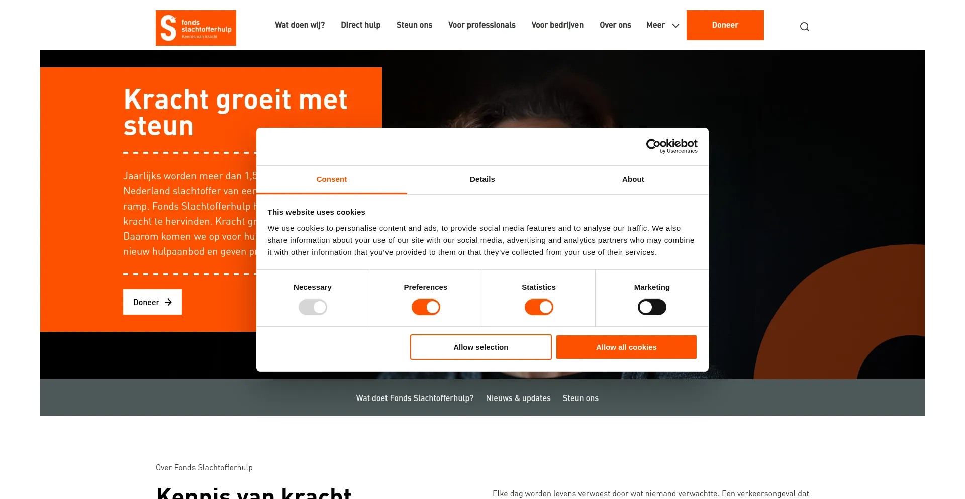 The website implements cookie consent mechanisms in compliance with privacy regulations such as GDPR or CCPA. This demonstrates that fondsslachtofferhulp.nl adheres to data protection standards and provides users with control over personal data collection practices.