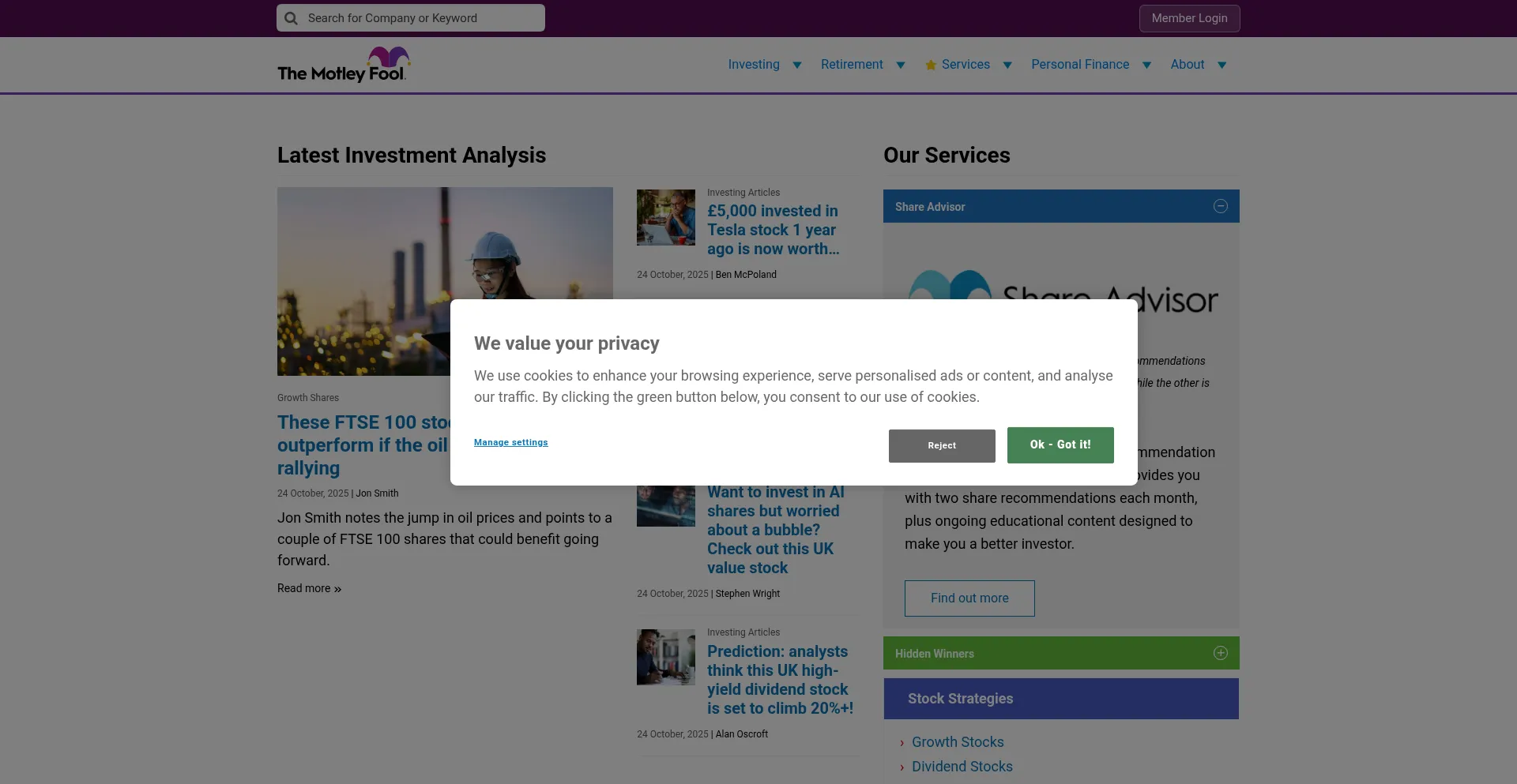 The website implements cookie consent mechanisms in compliance with privacy regulations such as GDPR or CCPA. This demonstrates that fool.co.uk adheres to data protection standards and provides users with control over personal data collection practices.