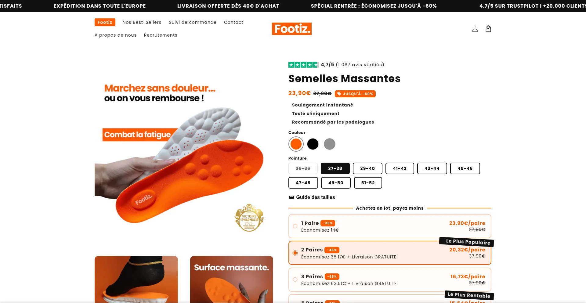 Découvrez les semelles massantes Footiz : Soulagement des douleurs instantané, amélioration immédiate du confort, soutien plantaire avec effet de massage ! Essayez-les 90 jo...