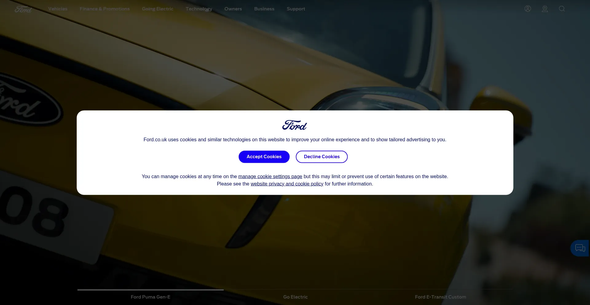 The website implements cookie consent mechanisms in compliance with privacy regulations such as GDPR or CCPA. This demonstrates that ford.co.uk adheres to data protection standards and provides users with control over personal data collection practices.