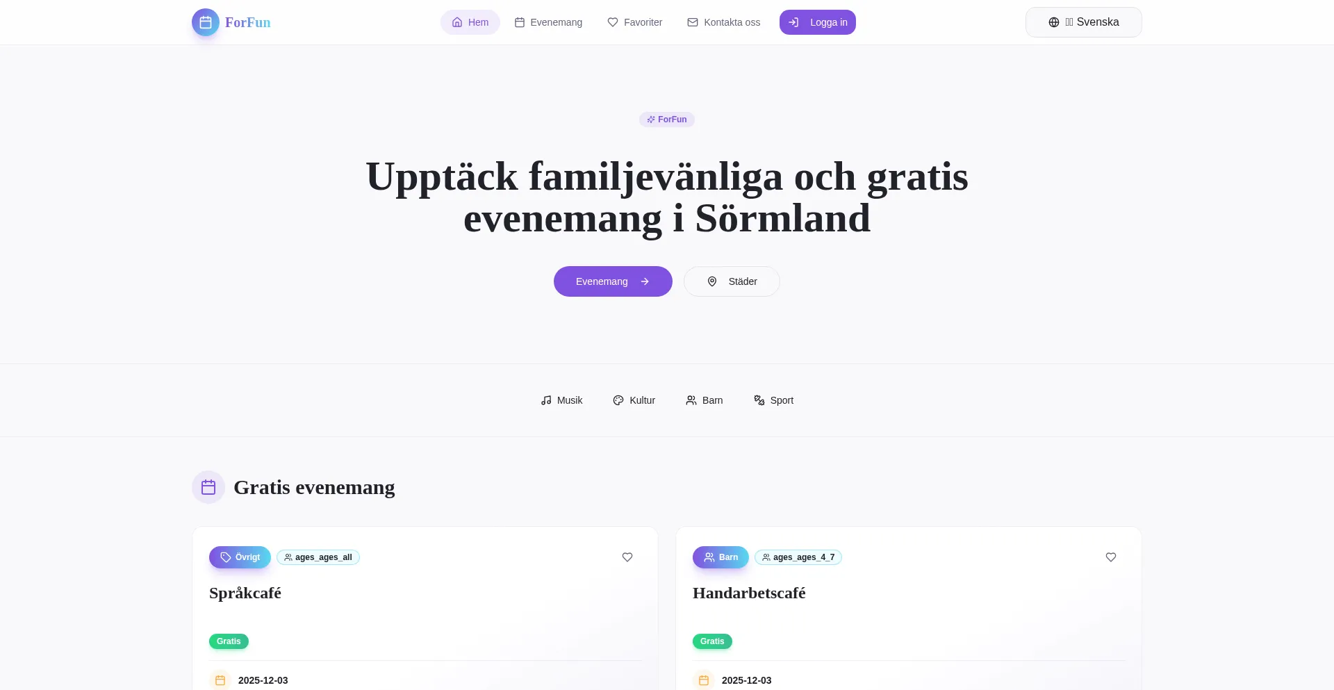 ForFun hjälper dig hitta familjevänliga och gratis/billiga evenemang i Sörmland. Flen, Katrineholm, Eskilstuna, Strängnäs, Nyköping, Gnesta.