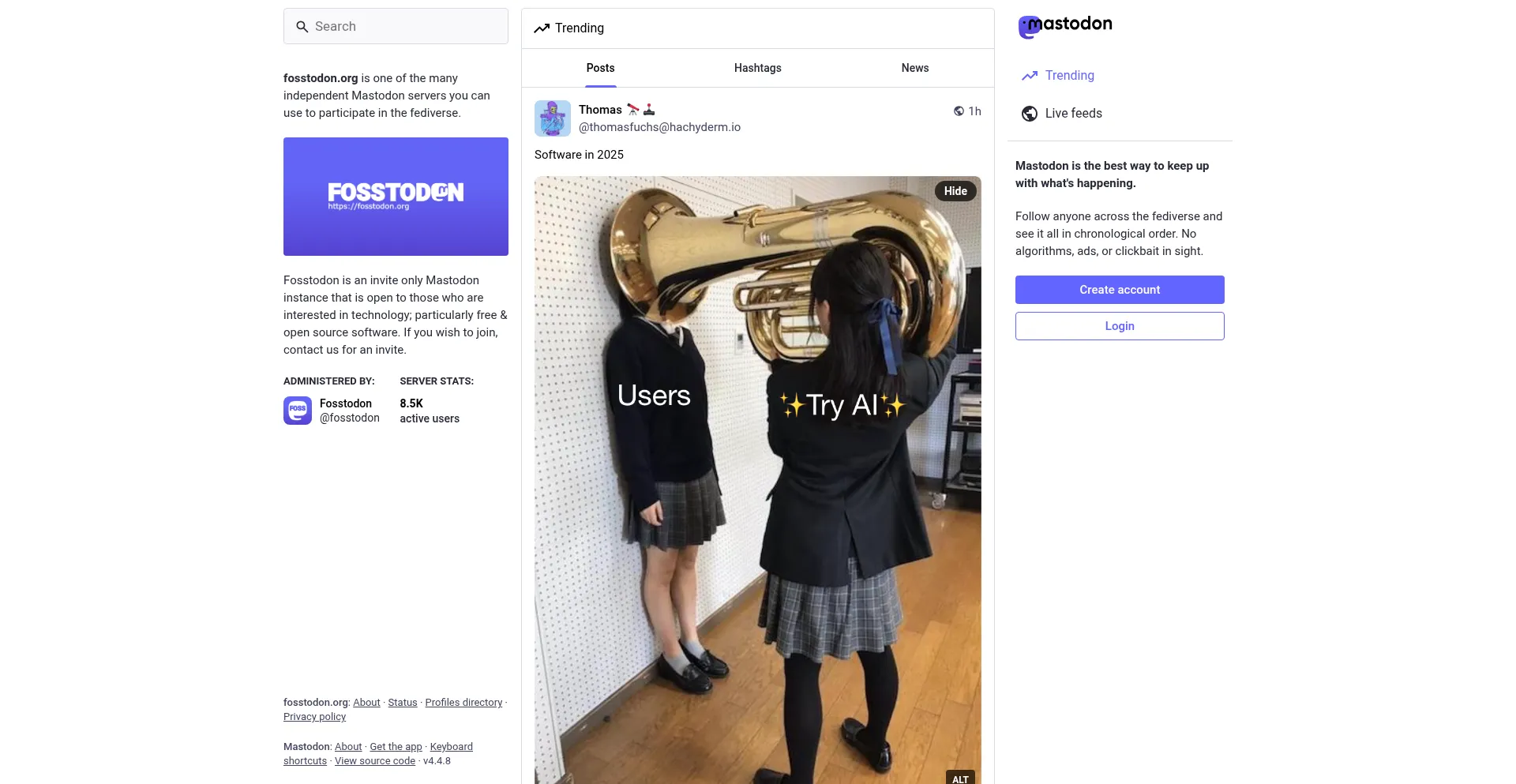 Fosstodon is an invite only Mastodon instance that is open to those who are interested in technology; particularly free & open source software. If you wish to join, contact us ...