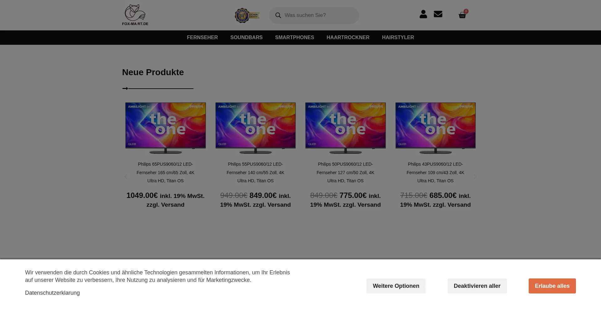 The website displays security certifications or trust seals from recognized authorities, indicating compliance with security standards, data protection protocols, or industry regulations. Trust seals from fox-mart.de suggest adherence to established security practices and operational transparency.