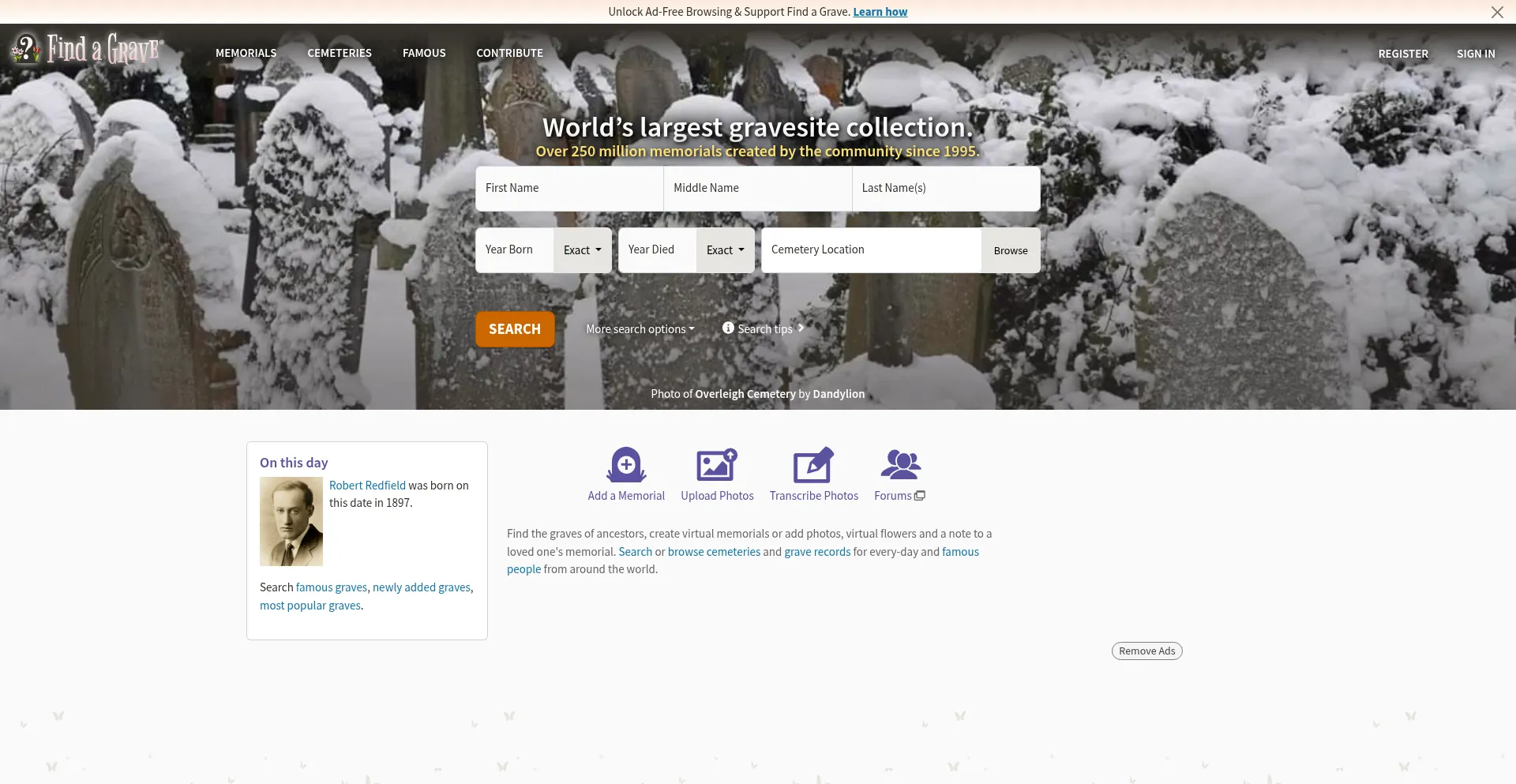 The World’s largest gravesite collection. Contribute, create and discover gravesites from all over the world. Find a Grave - Millions of Cemetery Records.