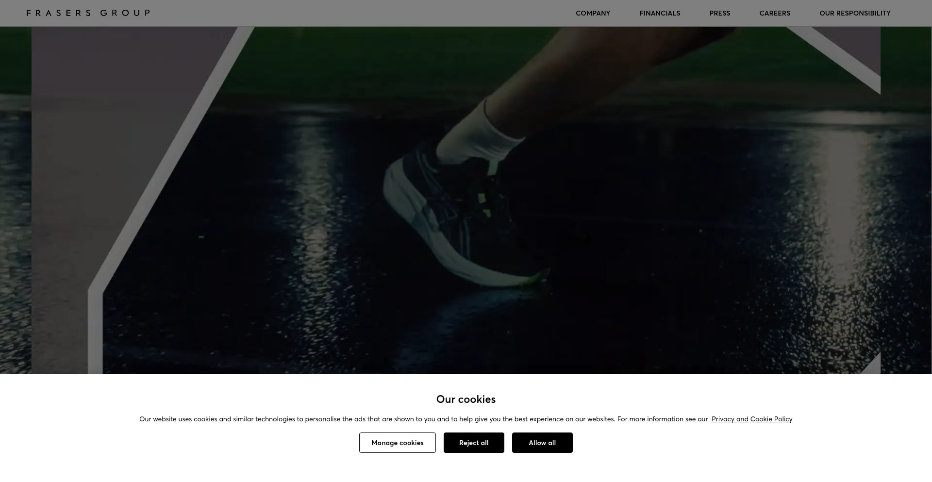 The website implements cookie consent mechanisms in compliance with privacy regulations such as GDPR or CCPA. This demonstrates that frasers.group adheres to data protection standards and provides users with control over personal data collection practices.