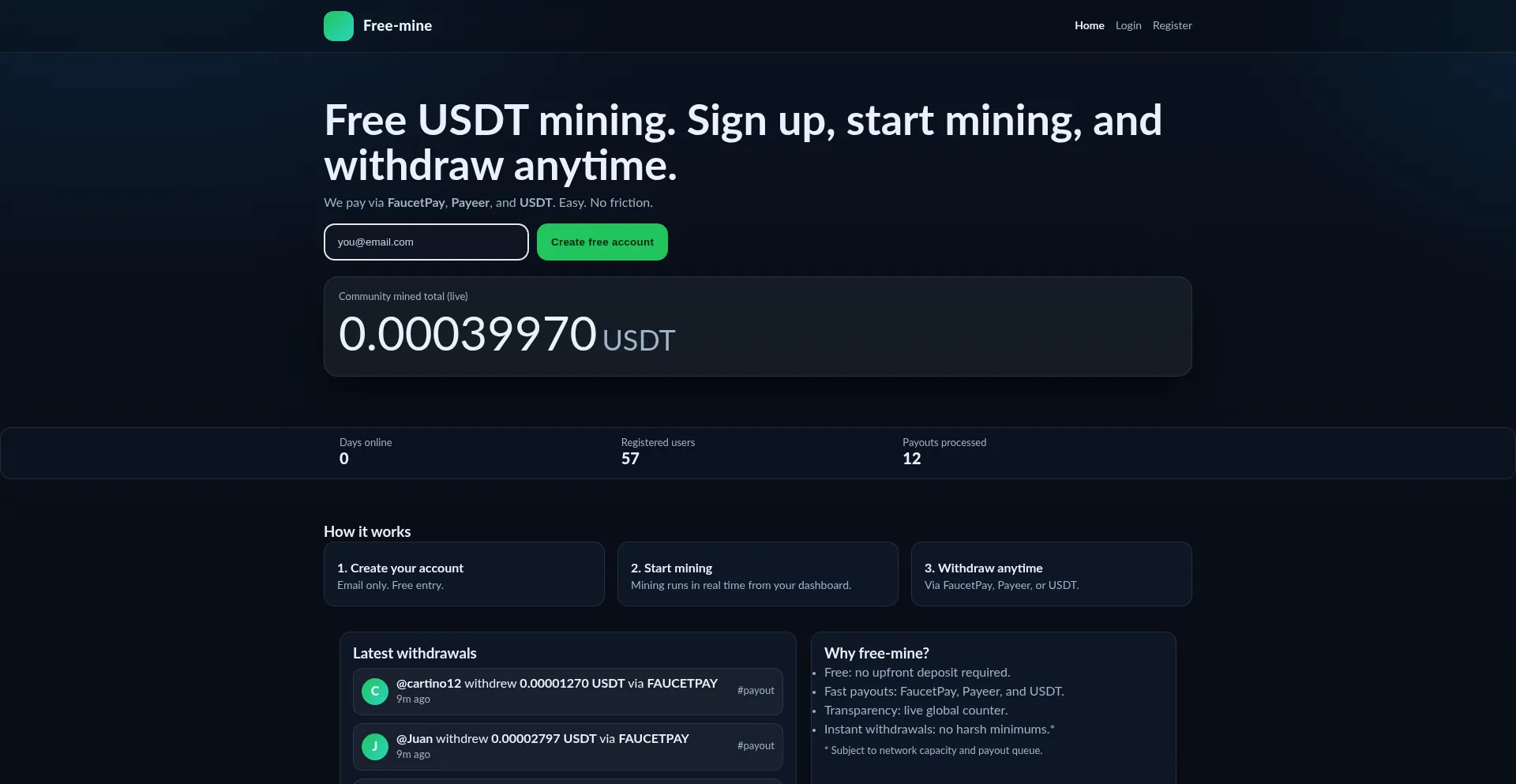 The free-mine.com probably offers cloud mining services or cryptocurrency mining investments. Some platforms provide legitimate mining rental services, while others may use fake mining dashboards to display virtual earnings that cannot be withdrawn.