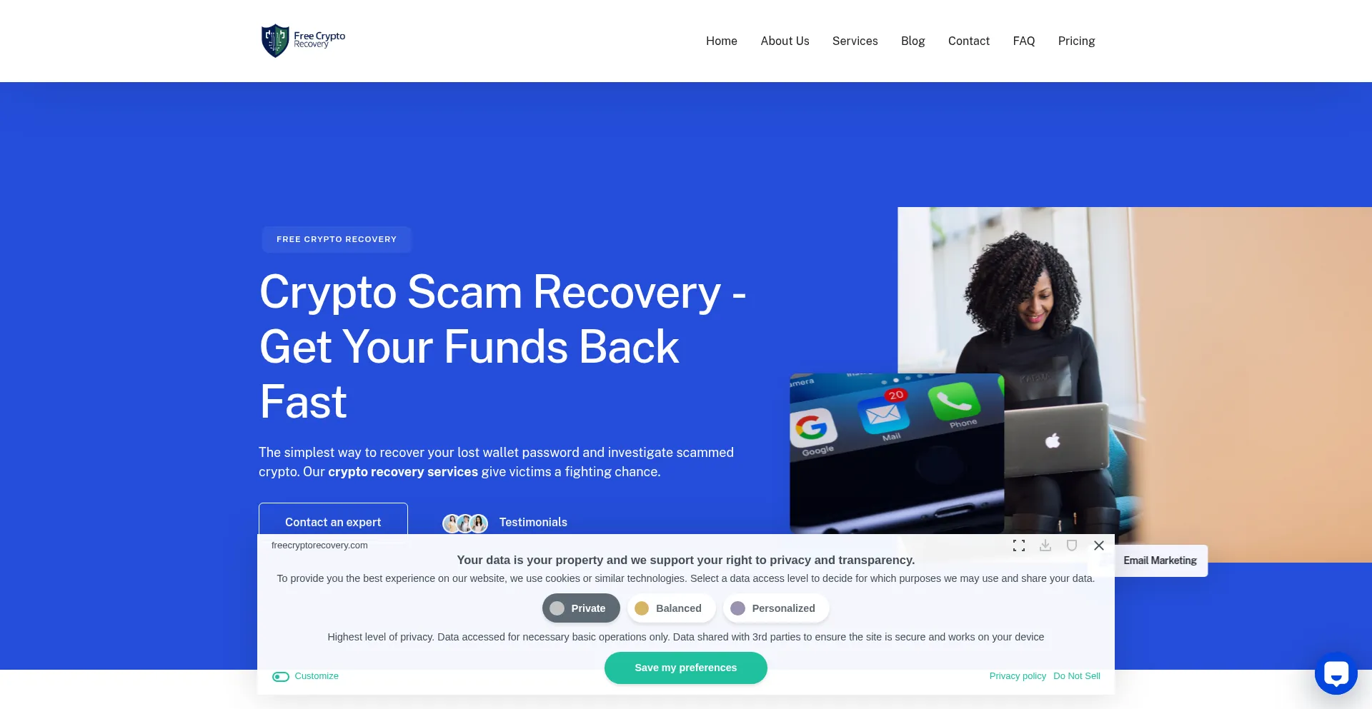 The website implements cookie consent mechanisms in compliance with privacy regulations such as GDPR or CCPA. This demonstrates that freecryptorecovery.com adheres to data protection standards and provides users with control over personal data collection practices.