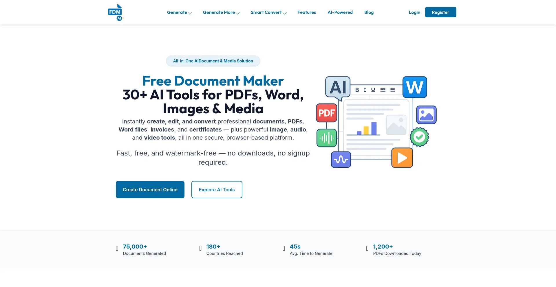 Free Document Maker (FDM AI) offers 30+ AI-powered tools to create, convert, and edit PDFs, Word docs, AI doc writer, invoices, images, audio & video — free and instant.