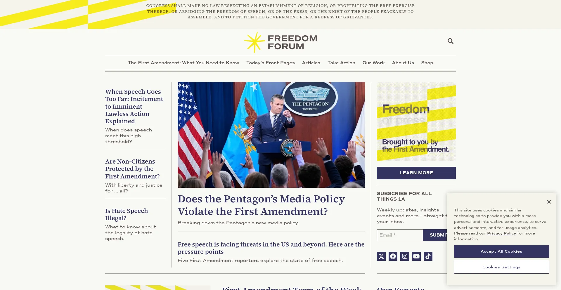 The website implements cookie consent mechanisms in compliance with privacy regulations such as GDPR or CCPA. This demonstrates that freedomforum.org adheres to data protection standards and provides users with control over personal data collection practices.
