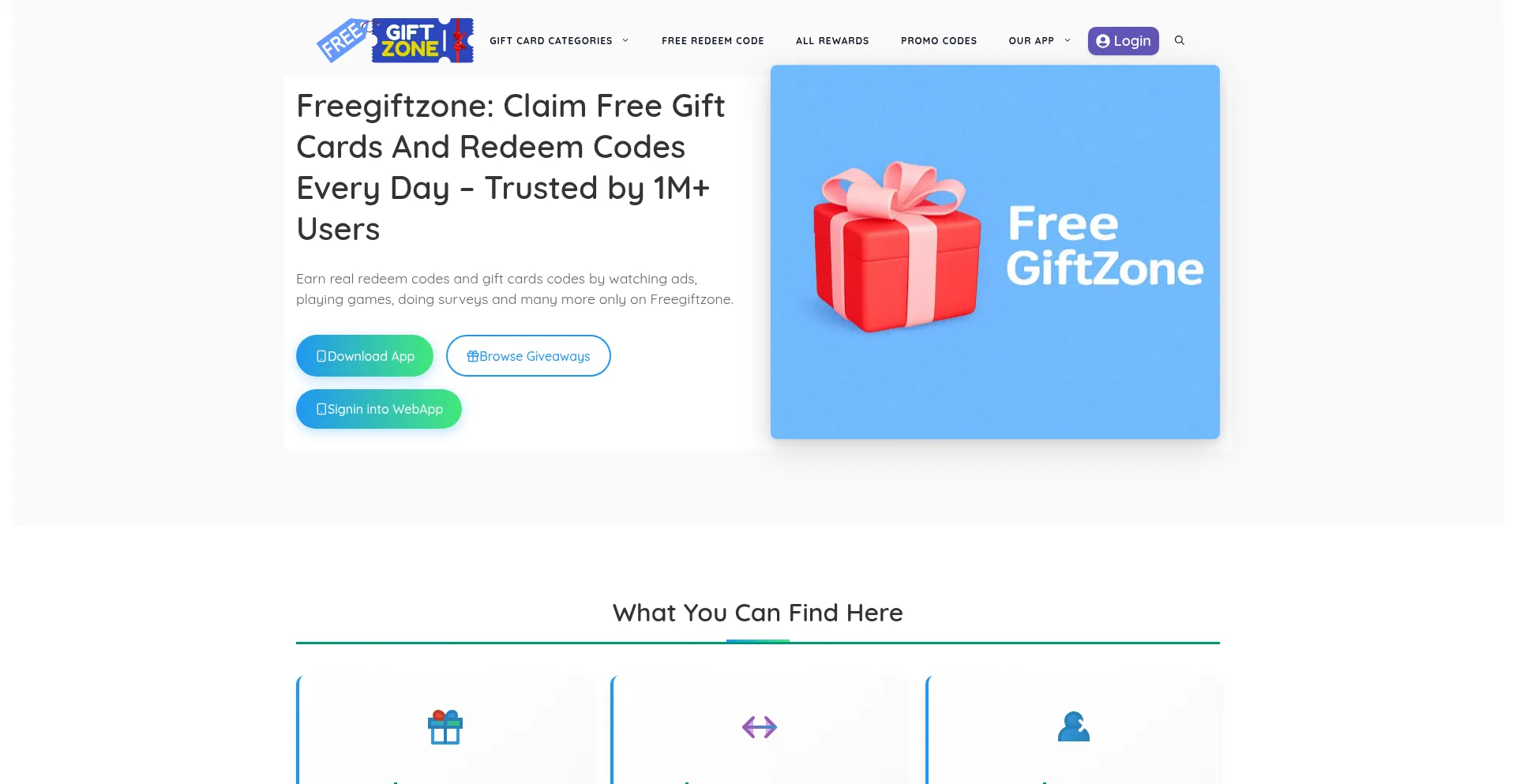 The freegiftzone.com website offers a mobile application for Android devices, indicating expanded platform presence beyond web-based services.