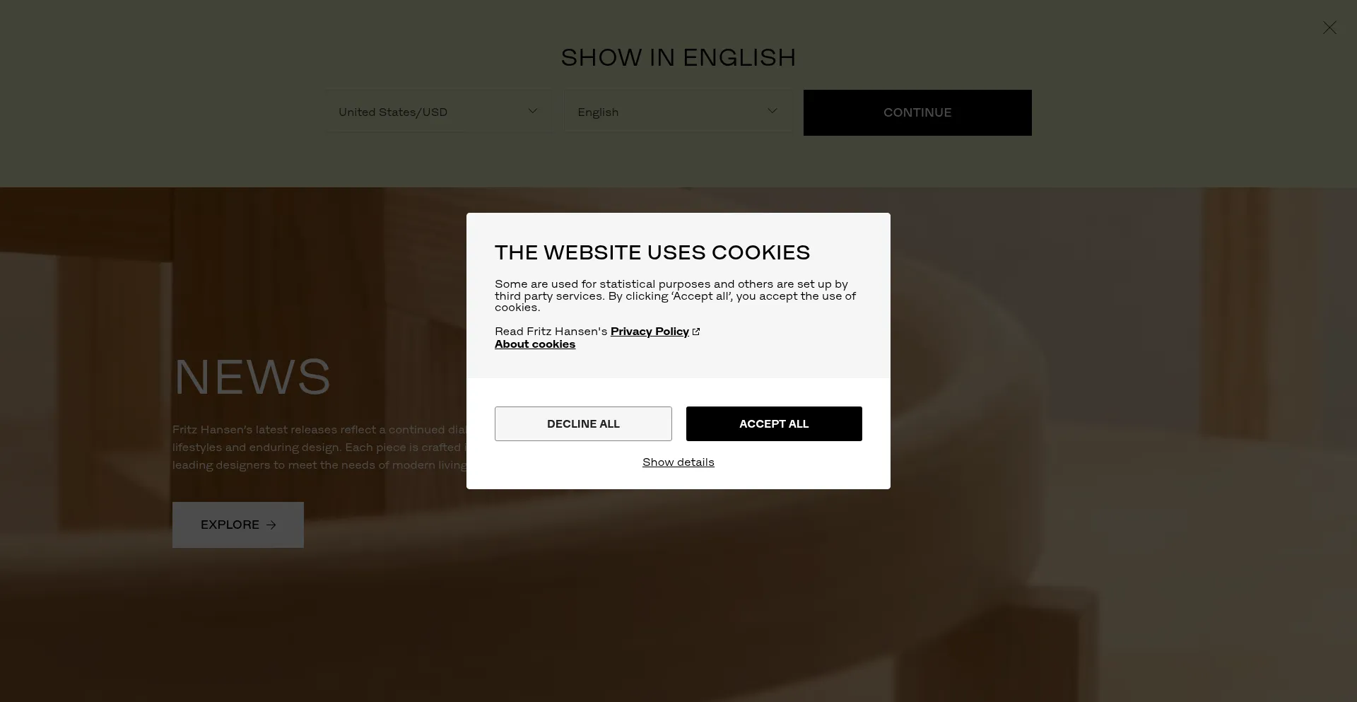 The website implements cookie consent mechanisms in compliance with privacy regulations such as GDPR or CCPA. This demonstrates that fritzhansen.com adheres to data protection standards and provides users with control over personal data collection practices.