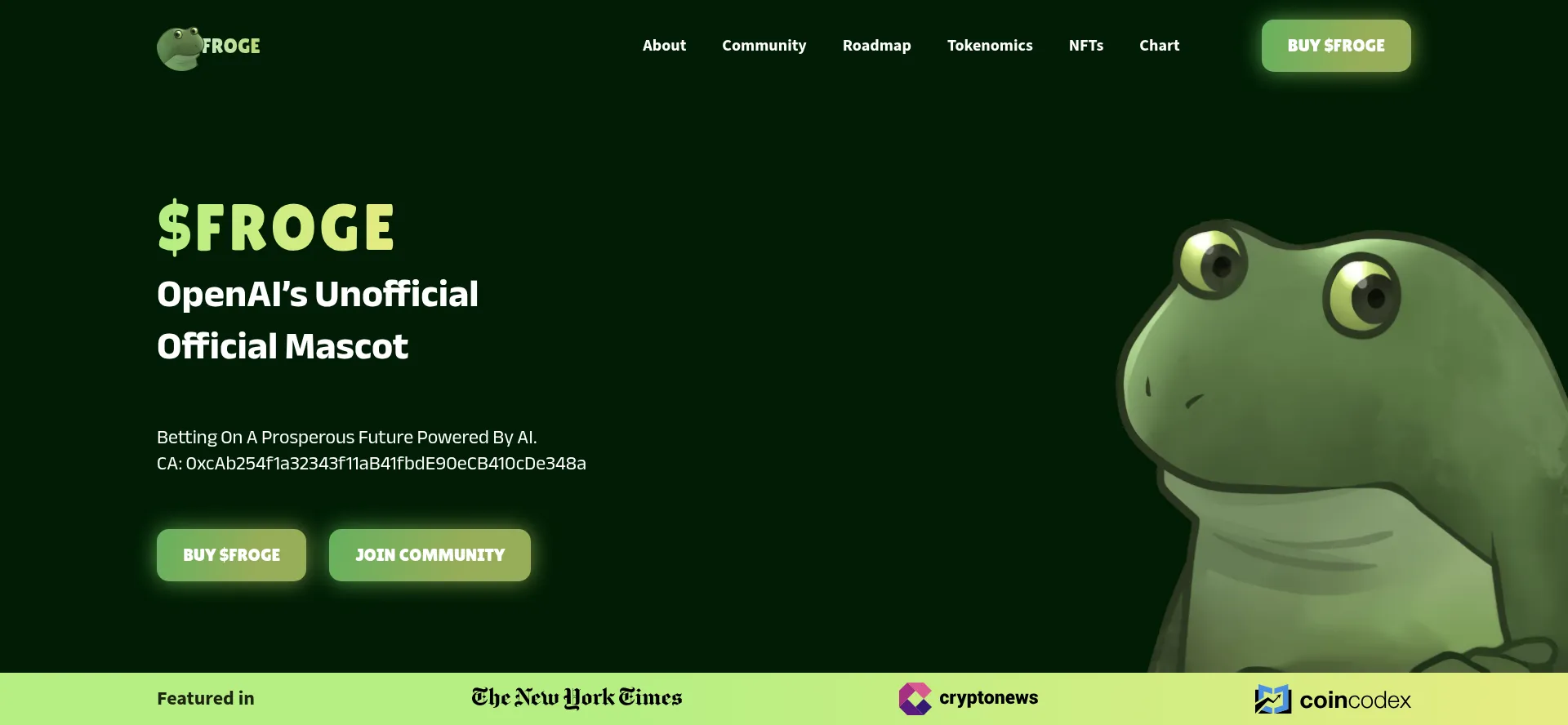 Unlock the power of memes with Froge: Dive into crypto with our Froge meme token, earn rewards on every swap, and discover unique NFTs. Your gateway to blockchain & AI innovatio...