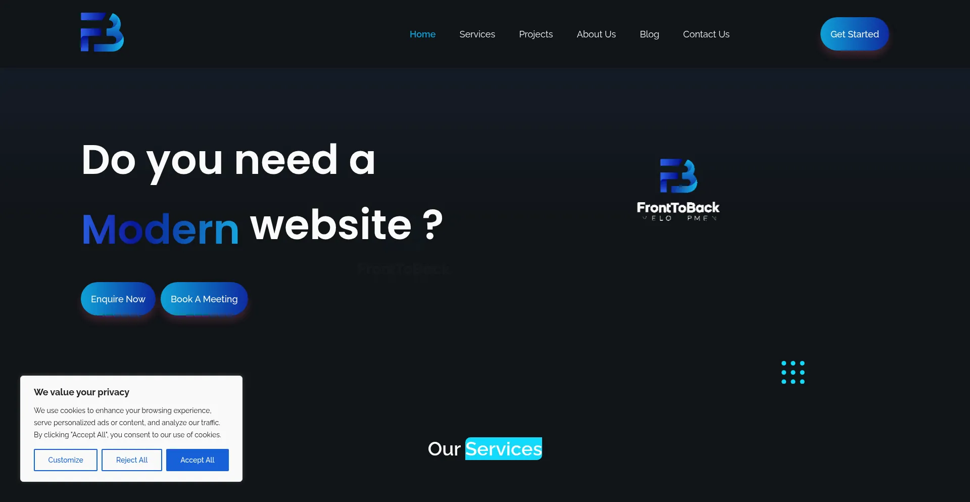 The website implements cookie consent mechanisms in compliance with privacy regulations such as GDPR or CCPA. This demonstrates that fronttobackdevelopment.com adheres to data protection standards and provides users with control over personal data collection practices.