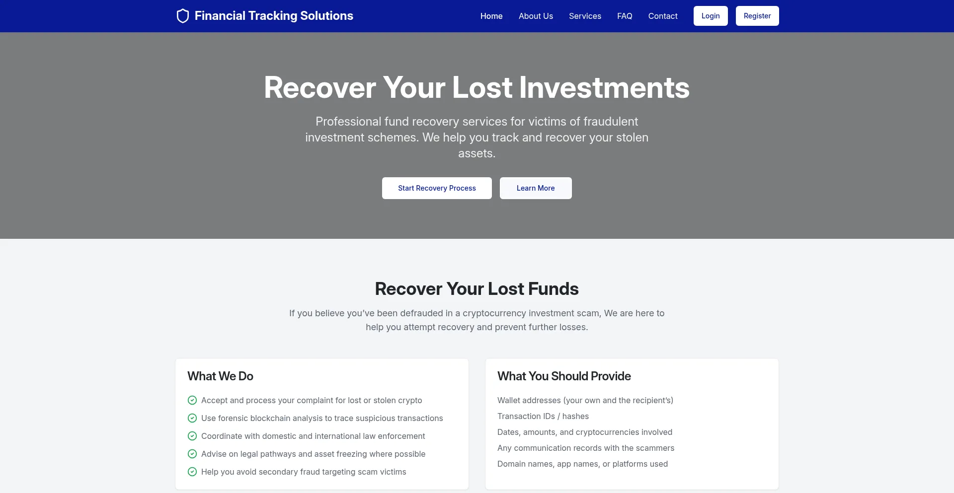 The website fts-hub.com advertises fund recovery services for lost or stolen assets. While some operate on contingency fee structures, others may require upfront payments, which can indicate fraudulent operations. Verify credentials and regulatory compliance before engaging such services.
