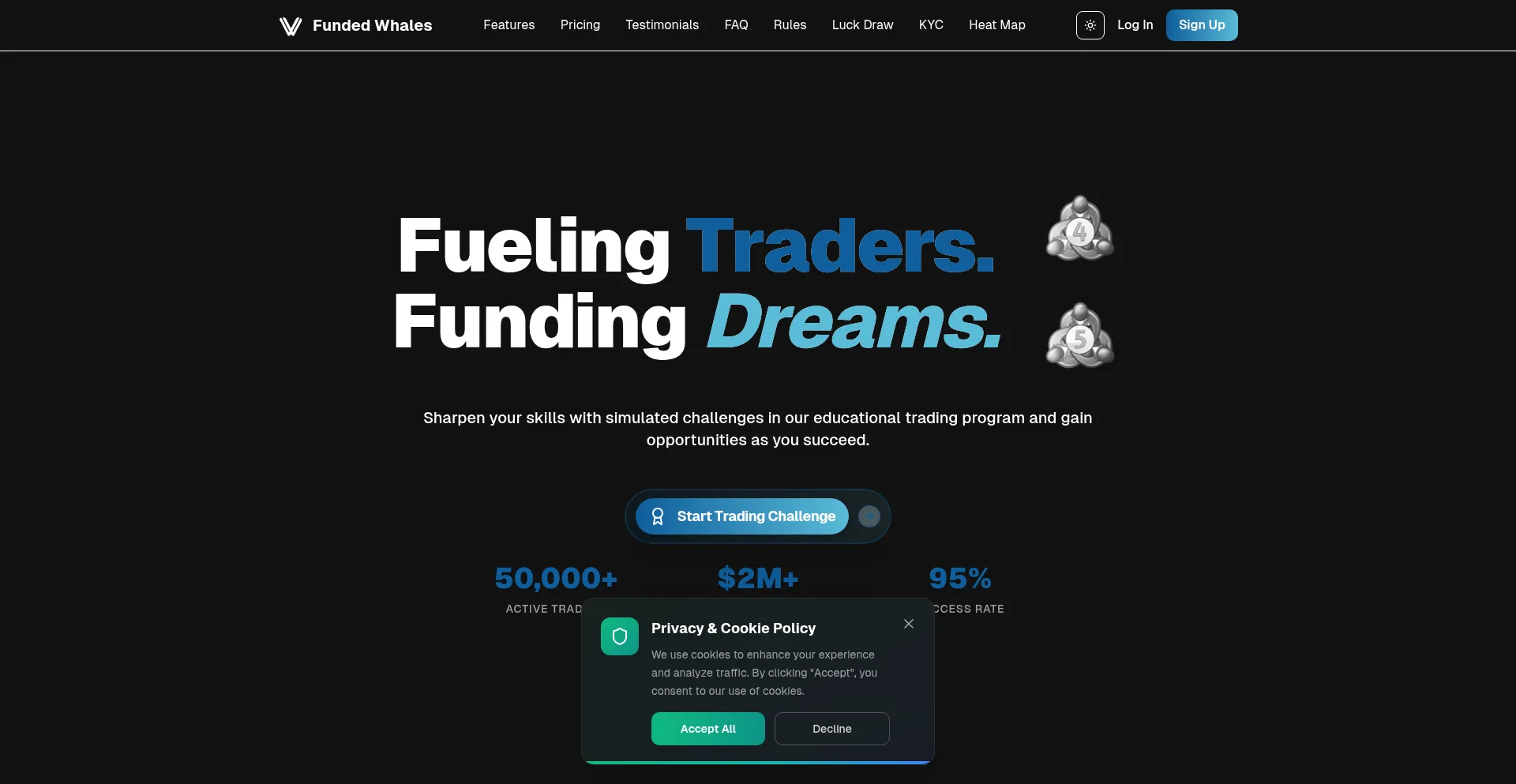 The website implements cookie consent mechanisms in compliance with privacy regulations such as GDPR or CCPA. This demonstrates that fundedwhales.com adheres to data protection standards and provides users with control over personal data collection practices.