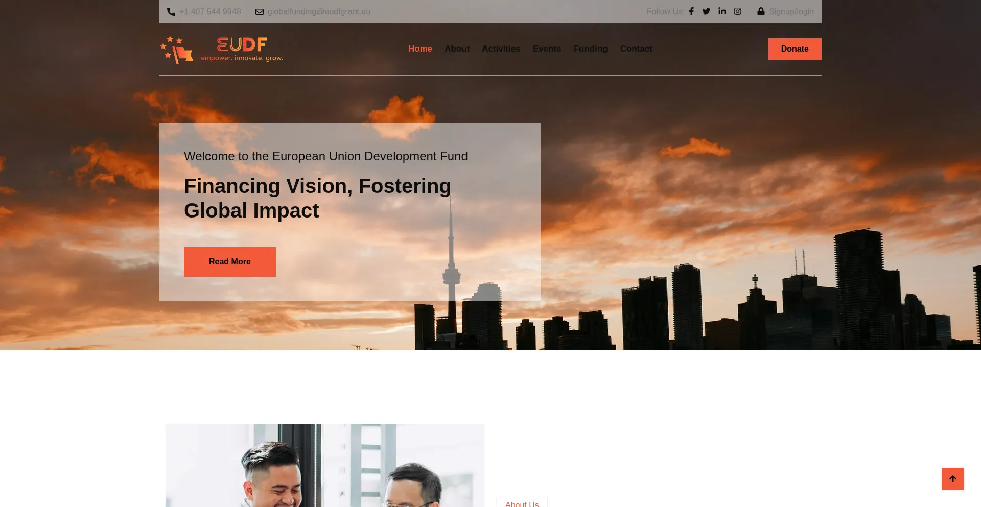 Analysis reveals that fundingeudfglobal.org displays social media icons or links that do not connect to legitimate social media profiles. This deceptive practice is commonly employed to create false legitimacy and represents a significant indicator of fraudulent intent requiring immediate caution.