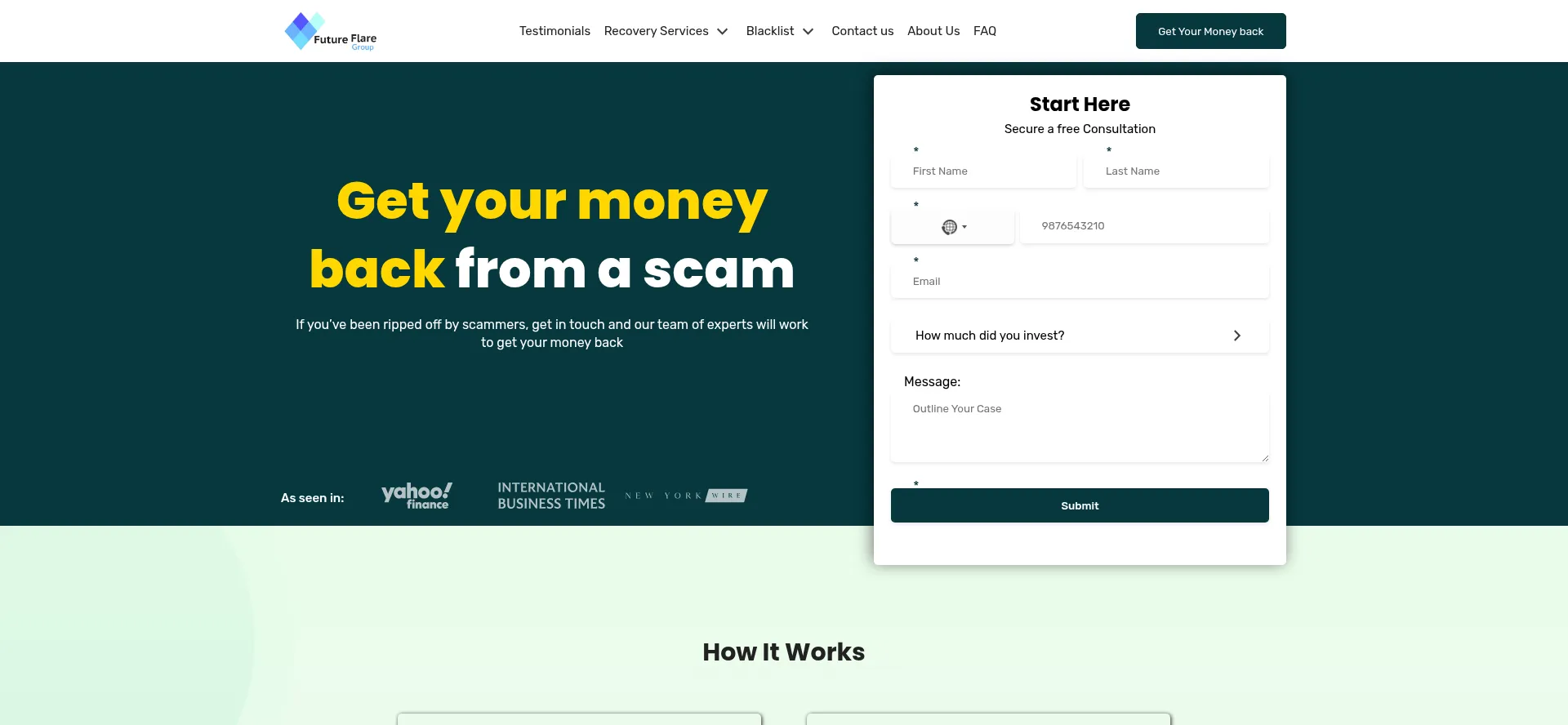 The website futureflaregroup.com advertises fund recovery services for lost or stolen assets. While some operate on contingency fee structures, others may require upfront payments, which can indicate fraudulent operations. Verify credentials and regulatory compliance before engaging such services.