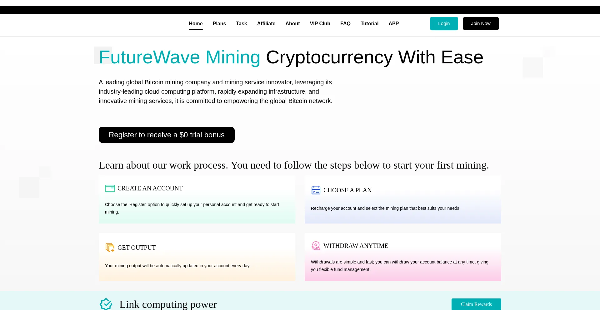 The futurejap.com probably offers cloud mining services or cryptocurrency mining investments. Some platforms provide legitimate mining rental services, while others may use fake mining dashboards to display virtual earnings that cannot be withdrawn.