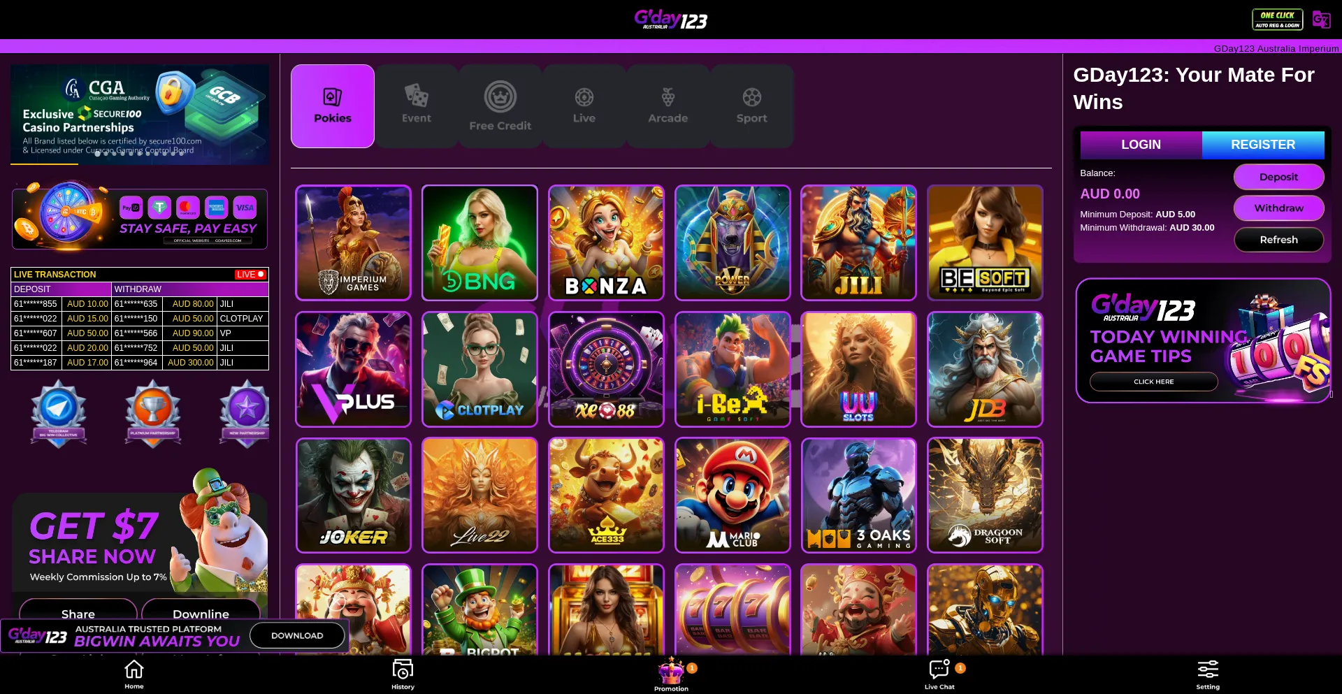 Play online pokies & casino in Australia! Enjoy free credit, VPower, JILI, Imperium, BNG & more at Gday123 – your top online gaming hub!