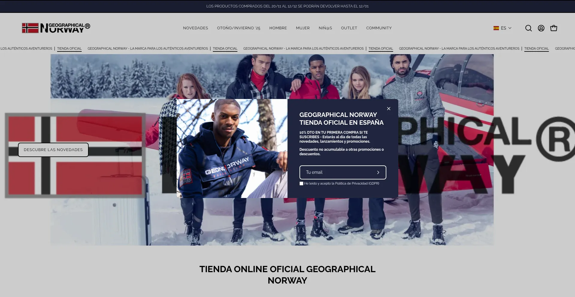 Analysis indicates that geographicalnorway.es operates as an e-commerce platform facilitating online transactions for goods or services. The website implements shopping cart functionality, payment processing systems, and product catalog features typical of commercial retail operations.