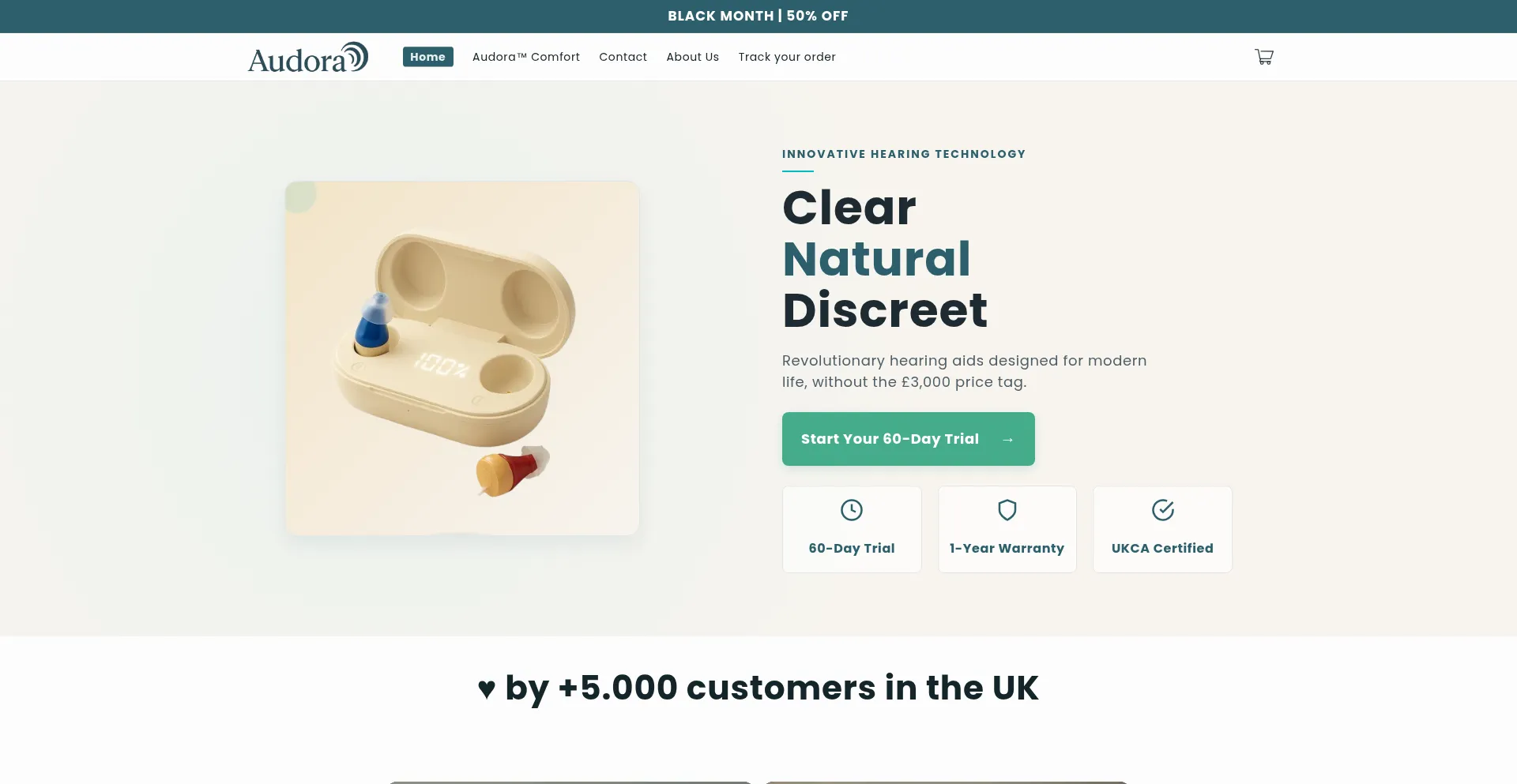 Audora™ Hearing Aids – Discreet, comfortable and powerful hearing support with AI noise reduction. Backed by a 2-year warranty and trusted by thousands across the UK.
