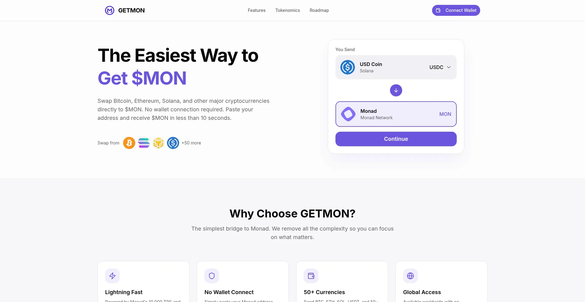 Swap 100+ cryptocurrencies directly to $MON on Monad. No wallet connection required.