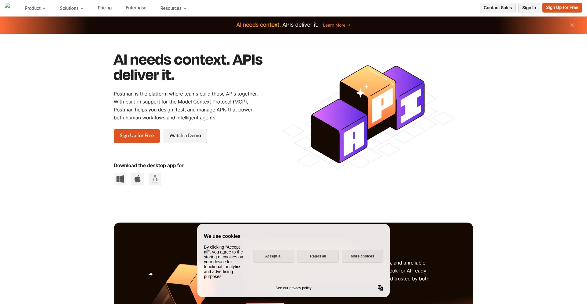 The getpostman.com website implements data collection forms that may request personal information including names, email addresses, phone numbers, or other sensitive details. Users should verify the legitimacy of it and review privacy policies before submitting personal data.