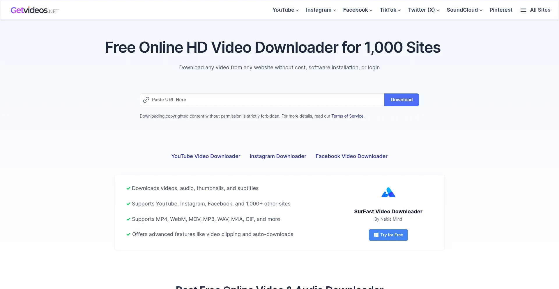 GetVideos.Net is a free online video downloader that can download videos from YouTube, TikTok, Facebook, Instagram, and other 1,000 sites.