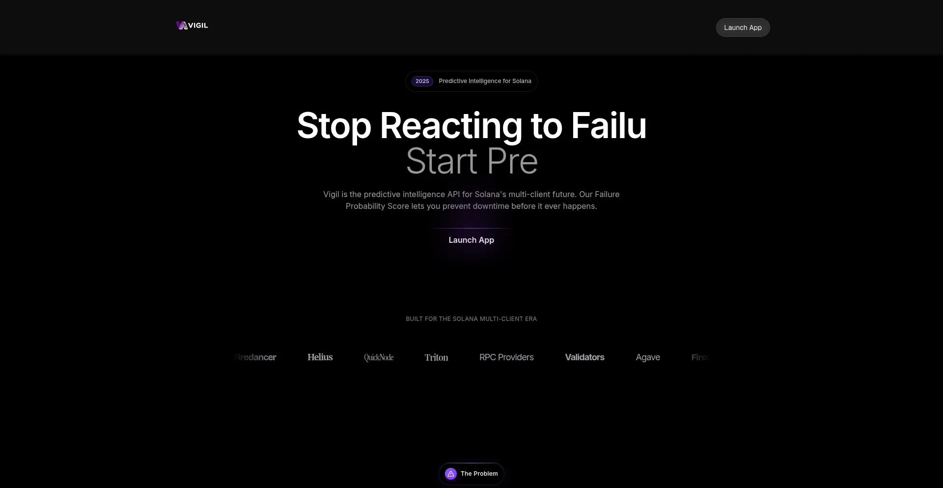 Stop reacting to failure. Start predicting it. Vigil is the predictive intelligence API for Solana's multi-client future.