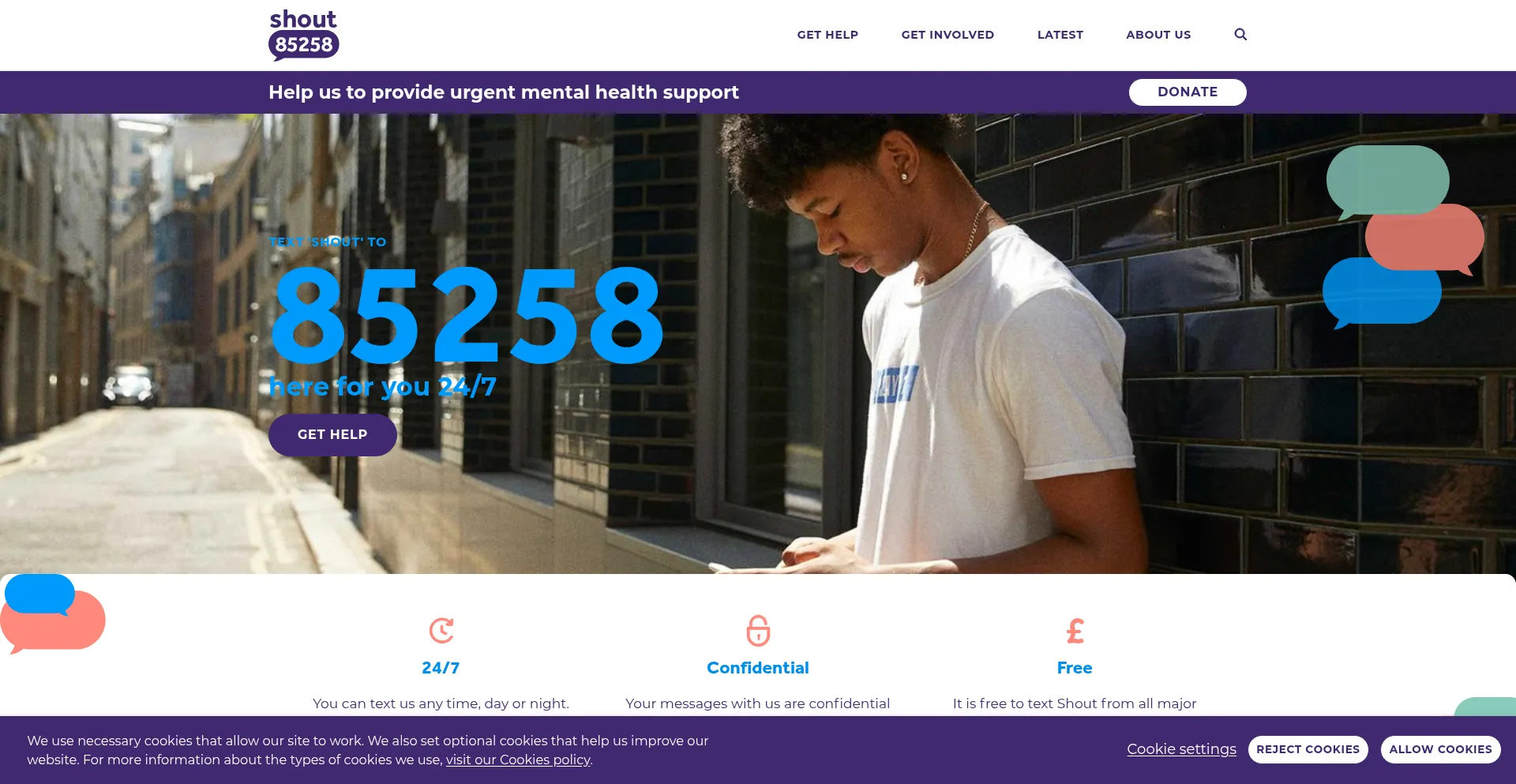 Shout is the UK's first and only 24/7 text service for anyone struggling with their mental health. Text 'Shout' to 85258 for free, confidential support anytime, anywhere