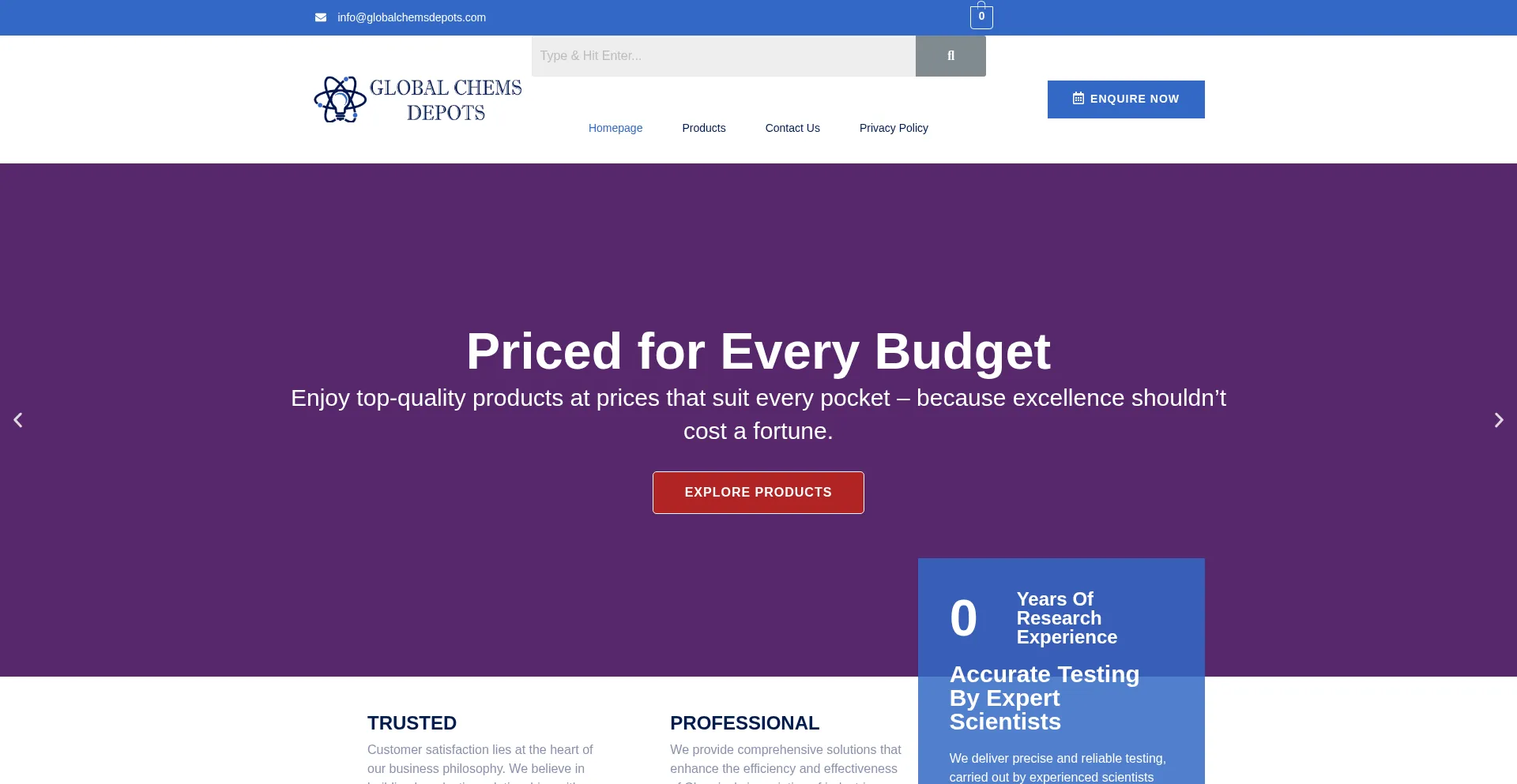 The globalchemsdepots.com website contains incomplete elements including placeholder content, unfinished features, or development artifacts, indicating ongoing construction or maintenance. This may reflect inadequate quality assurance processes or premature deployment, potentially affecting site reliability and user experience.