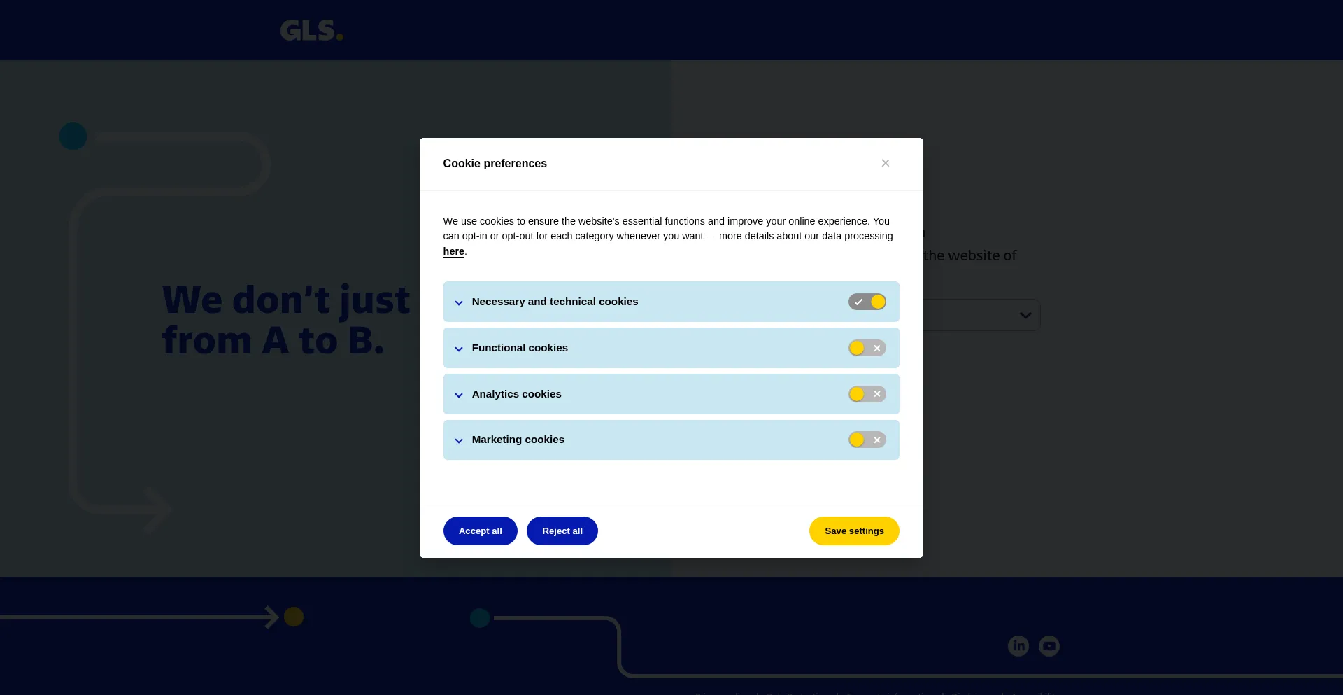 The website implements cookie consent mechanisms in compliance with privacy regulations such as GDPR or CCPA. This demonstrates that gls-group.eu adheres to data protection standards and provides users with control over personal data collection practices.