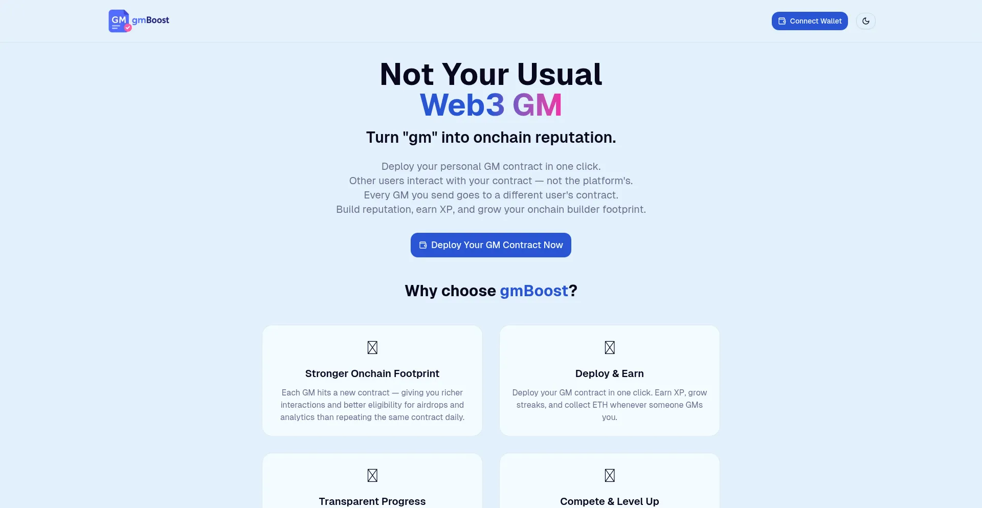 gmBoost - Deploy smart contracts, earn XP, and compete with developers worldwide
