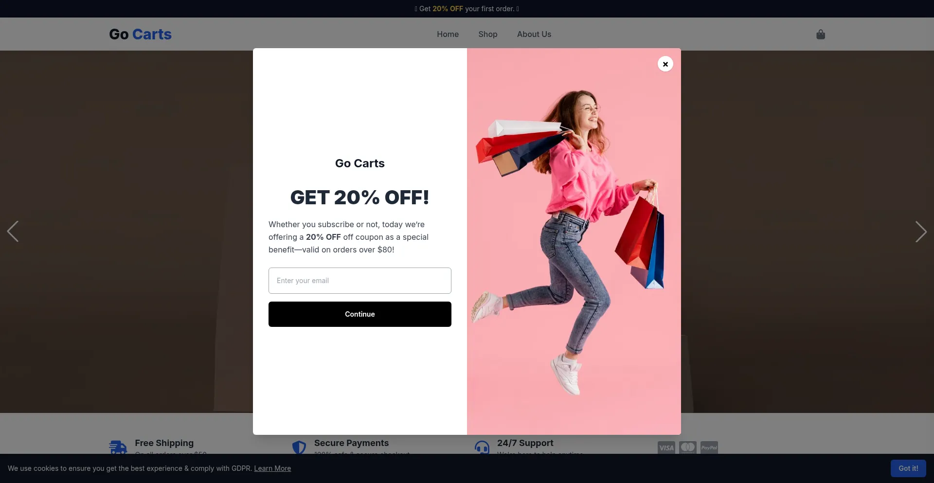 The website implements cookie consent mechanisms in compliance with privacy regulations such as GDPR or CCPA. This demonstrates that gocarts.shop adheres to data protection standards and provides users with control over personal data collection practices.