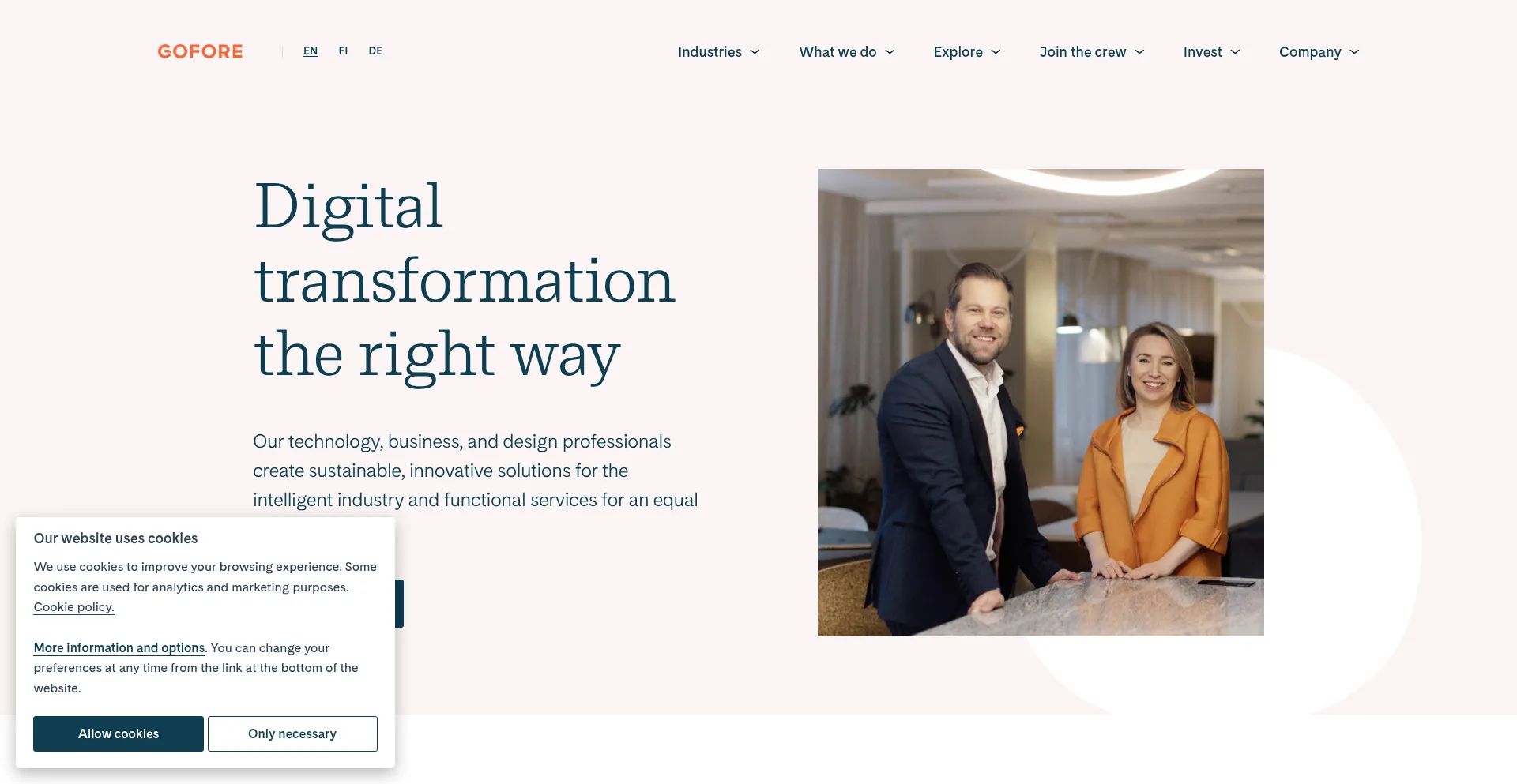 The website implements cookie consent mechanisms in compliance with privacy regulations such as GDPR or CCPA. This demonstrates that gofore.com adheres to data protection standards and provides users with control over personal data collection practices.