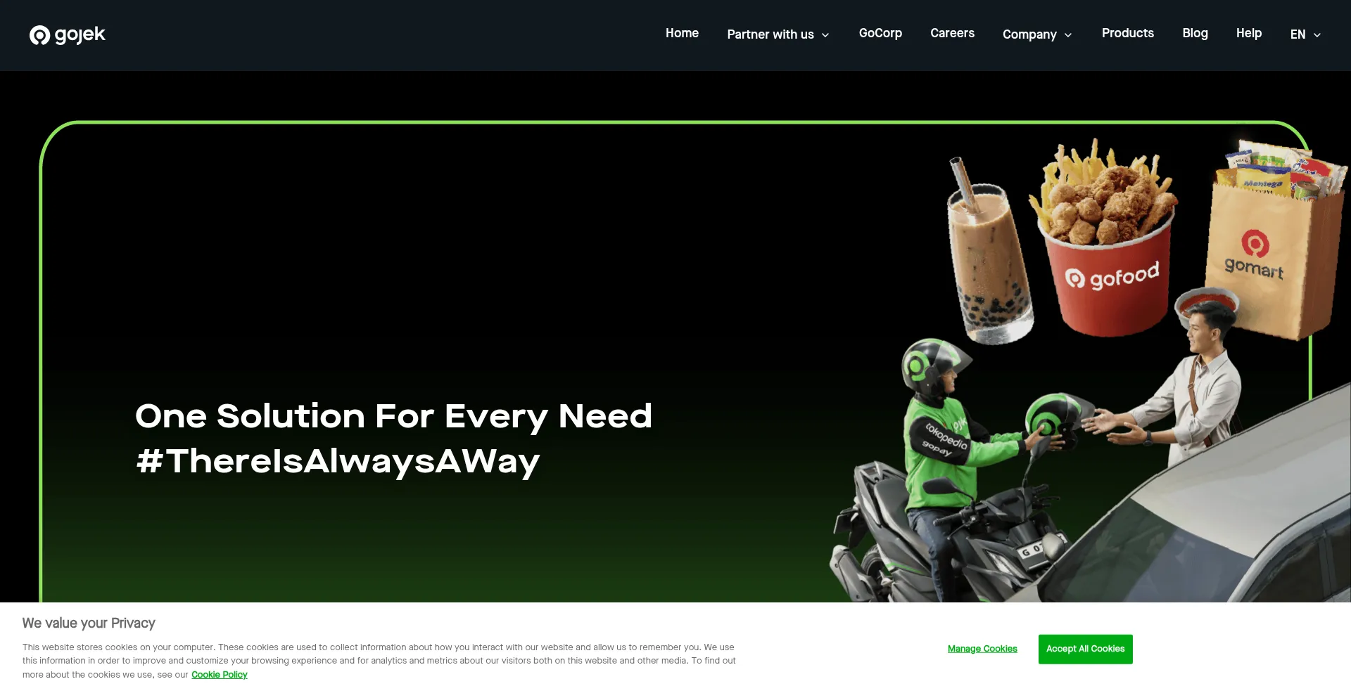The gojek.com website uses Google Tag Manager to add and update tracking tags on its website.