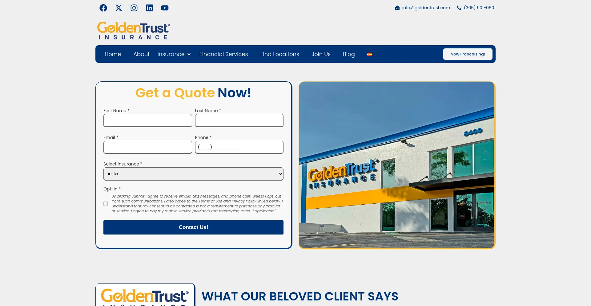 GoldenTrust Insurance offers auto, home, health and life insurance quotes in Florida. Contact GoldenTrust Insurance for a fast and accurate quote.