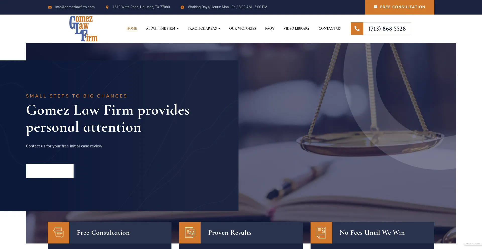 The gomezlawfirm.com website employs search engine optimization (SEO) techniques to improve its visibility and ranking in search engine results pages (SERPs).