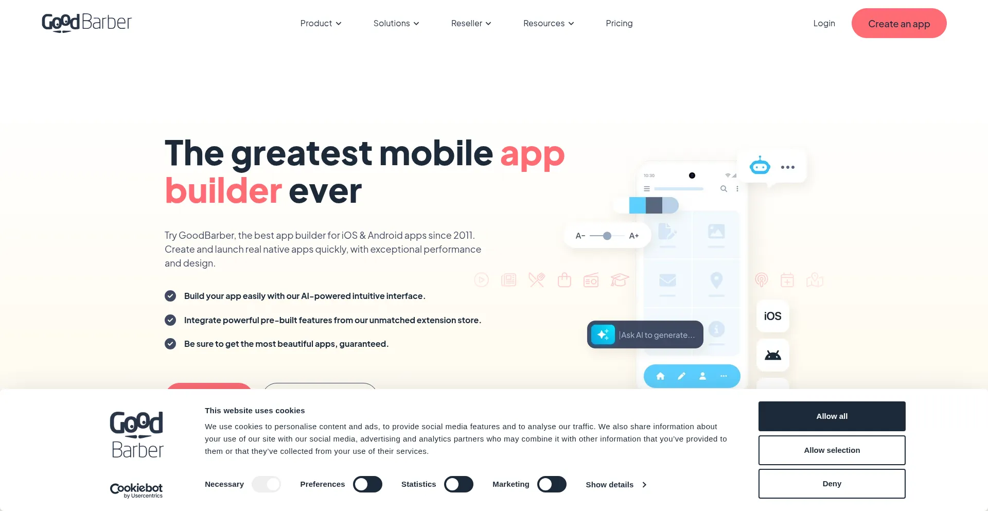 The website implements cookie consent mechanisms in compliance with privacy regulations such as GDPR or CCPA. This demonstrates that goodbarber.com adheres to data protection standards and provides users with control over personal data collection practices.