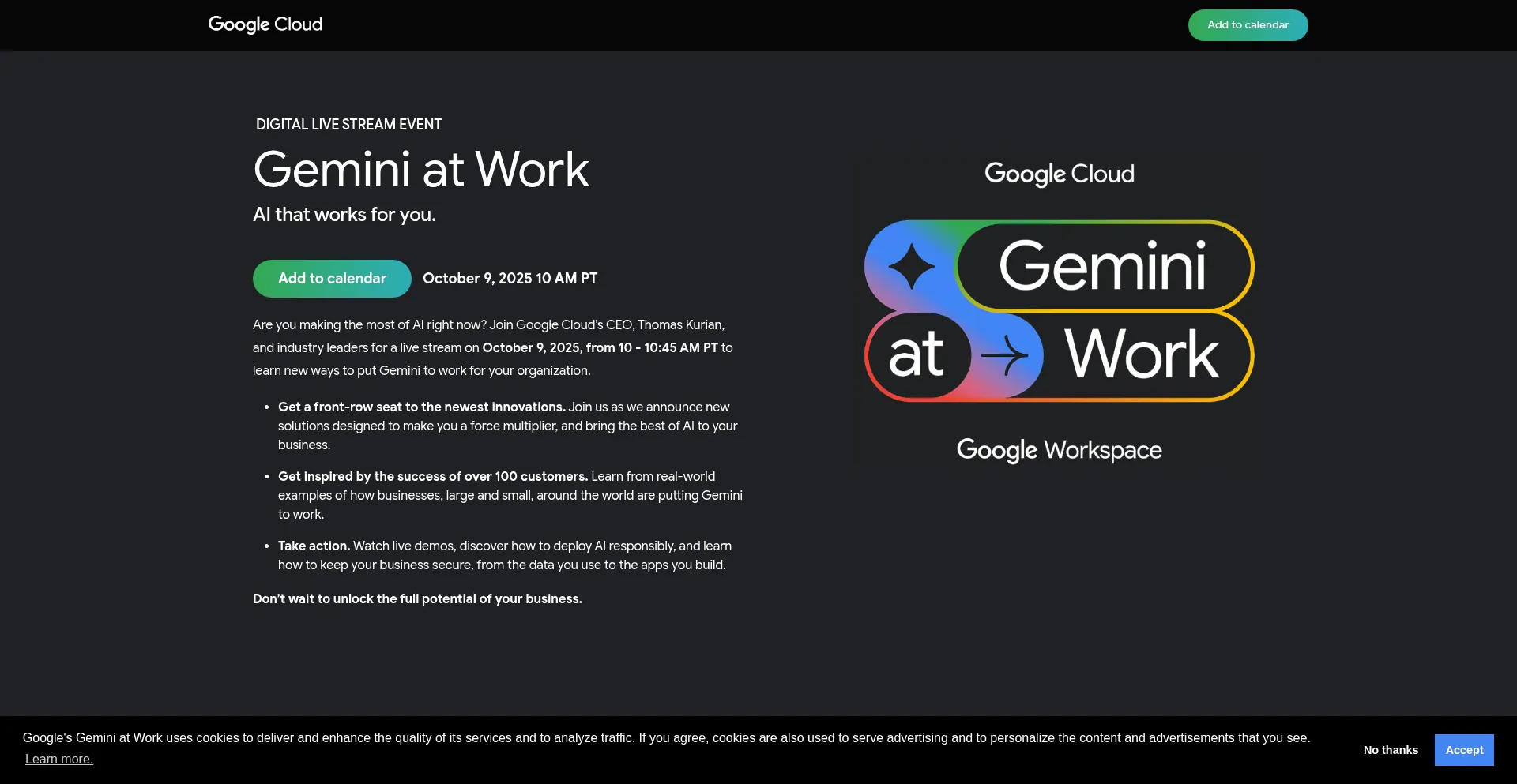The website implements cookie consent mechanisms in compliance with privacy regulations such as GDPR or CCPA. This demonstrates that googlecloudevents.com adheres to data protection standards and provides users with control over personal data collection practices.