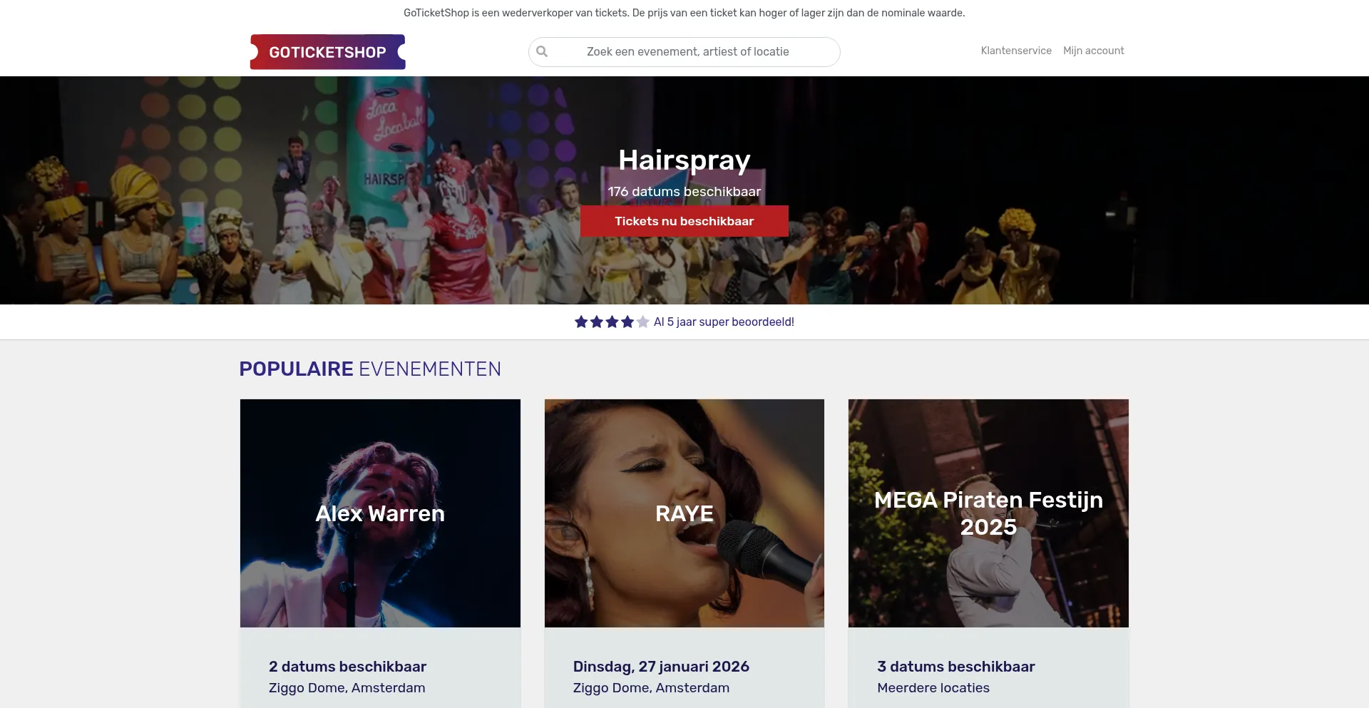 Tickets voor concerten, festivals en sport te koop bij GoTicketShop. Altijd veilig en goedkoop en zonder verzend- of verwerkingskosten.
