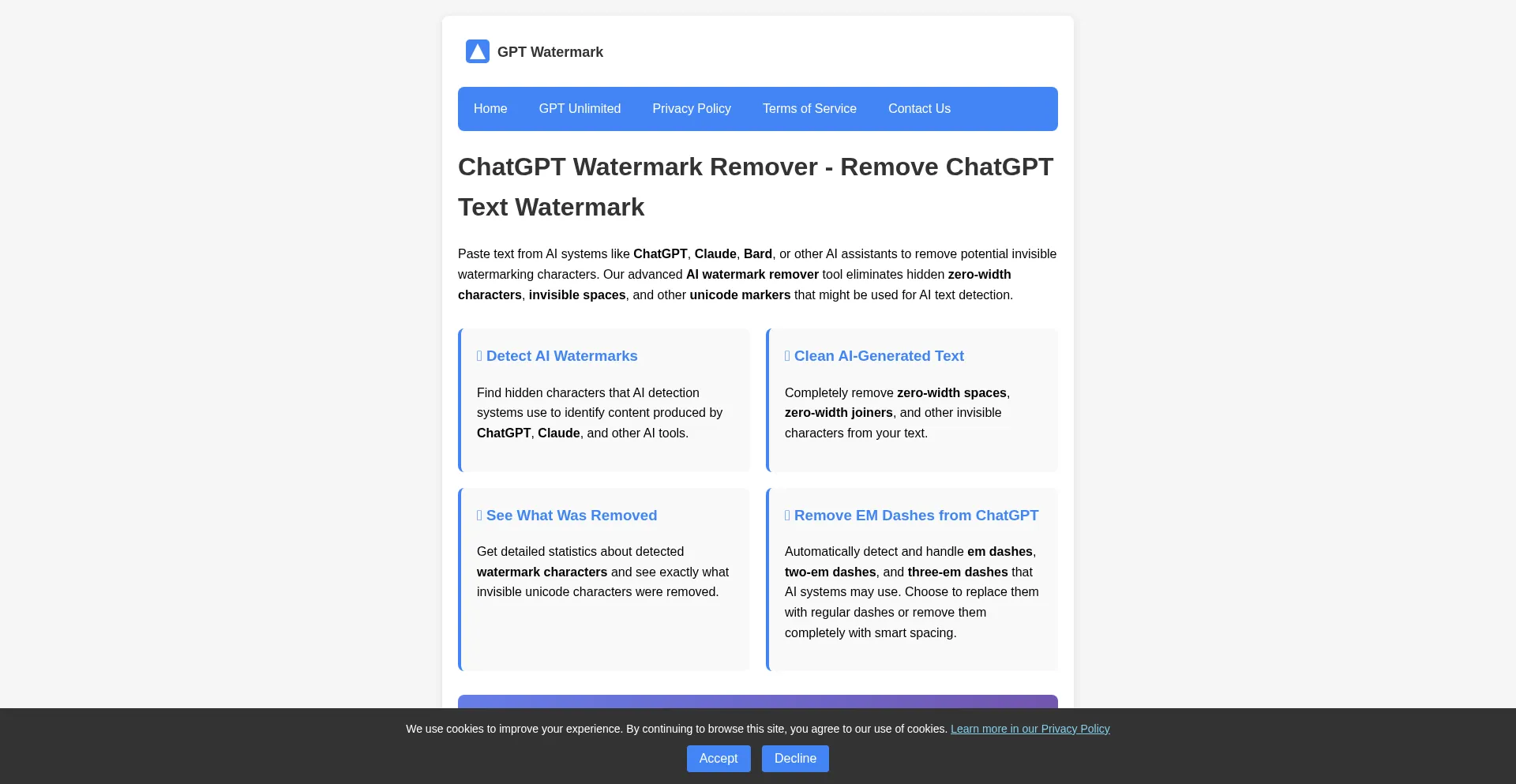 The website implements cookie consent mechanisms in compliance with privacy regulations such as GDPR or CCPA. This demonstrates that gptwatermark.com adheres to data protection standards and provides users with control over personal data collection practices.