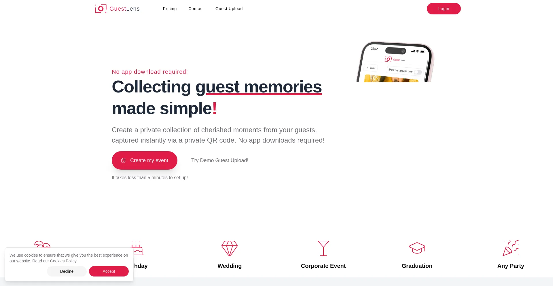 GuestLens - Relive your event day from your guest photos! A simple photo sharing with QR code for guests.
