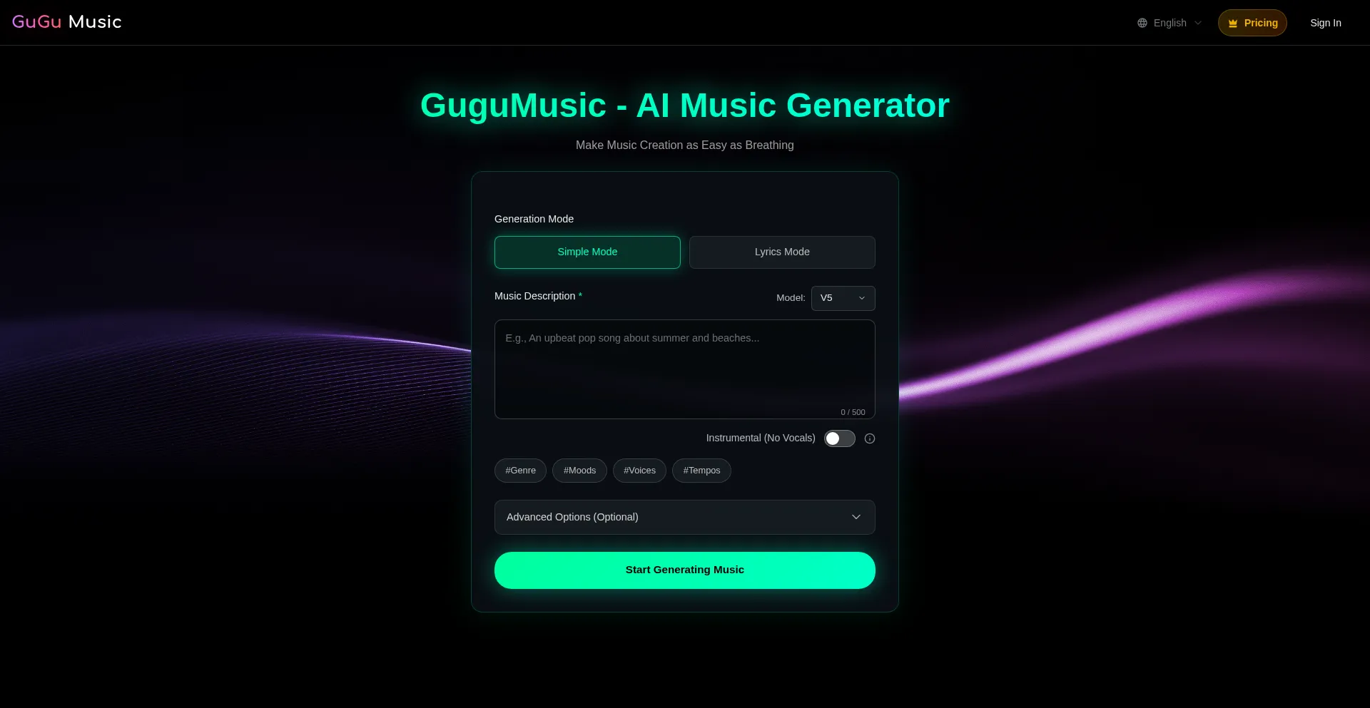 GuguMusic: Professional AI music generator for text-to-music, lyrics creation, and vocal separation. Create royalty-free original music for musicians, video creators, and conten...