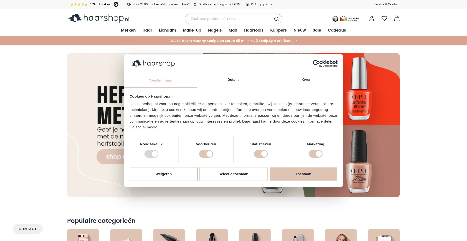 The website implements cookie consent mechanisms in compliance with privacy regulations such as GDPR or CCPA. This demonstrates that haarshop.nl adheres to data protection standards and provides users with control over personal data collection practices.