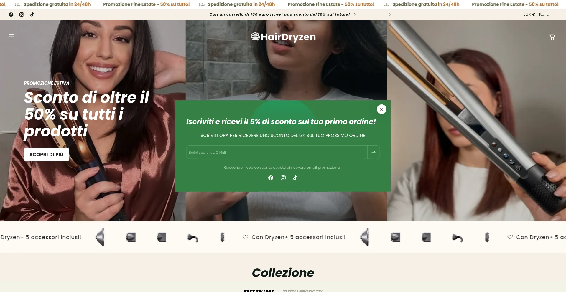 Our analyzer determines that website hairdryzen.it is using Shopify CMS. Shopify is a popular e-commerce platform, powering around 4.4% of websites globally.