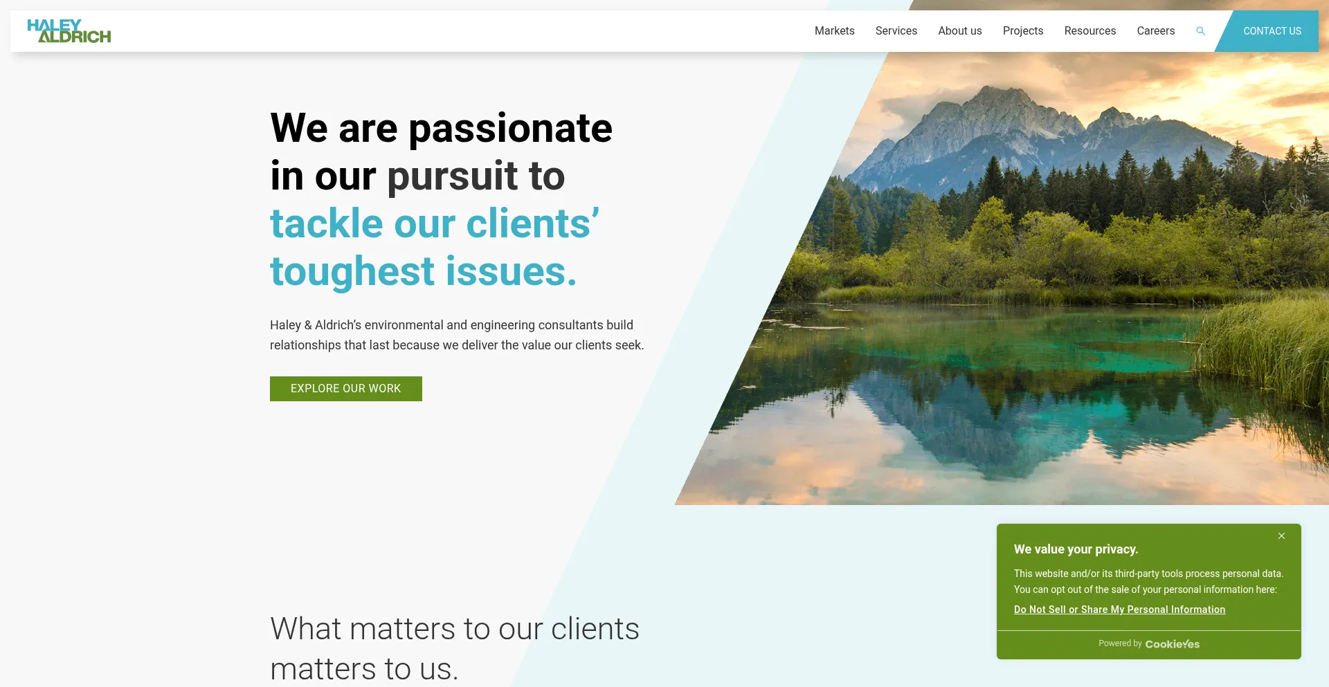 The website implements cookie consent mechanisms in compliance with privacy regulations such as GDPR or CCPA. This demonstrates that haleyaldrich.com adheres to data protection standards and provides users with control over personal data collection practices.